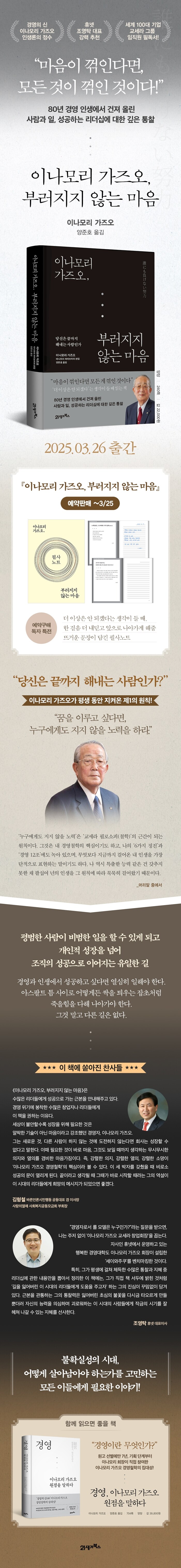 À̳ª¸ð¸® °¡Áî¿À¶õ À̸§ µÚ¿¡ ºÙ´Â ¼ö½Ä¾î´Â È·ÁÇÏ´Ù. ±³¼¼¶ó¿Í KDDIÀÇ Ã¢¾÷ÁÖ, ÀϺ» 3´ë °æ¿µÀÎ Áß ÇÑ ¸íÀÌÀÚ »ì¾Æ»ýÀü °æ¿µÀÇ ½ÅÀ̶ó ºÒ·È´ø »ç¶÷, 78¼¼ÀÇ ³ªÀÌ¿¡ ÆÄ»ê Á÷Àü¿¡ ¸ô¸° ÀϺ»Ç×°ø(JAL)ÀÇ ¹«º¸¼ö ȸÀåÀ¸·Î ÃëÀÓÇØ 3³â ¸¸¿¡ ÈæÀÚ ±×·¡ÇÁ¸¦ Àϱų½ Àü¹® °æ¿µÀÎ. ÇÏÁö¸¸ ±×°¡ Áö±Ý±îÁö ²÷ÀÓ¾øÀÌ È¸ÀڵǴ ÀÌÀ¯´Â, ÀÌ·¯ÇÑ ¾÷Àû ¶§¹®¸¸Àº ¾Æ´Ï´Ù. ¼ö¸¹Àº »ç¶÷µéÀÌ ¾ÆÁ÷µµ ±×ÀÇ Á¶¾ðÀ» ã´Â ÀÌÀ¯´Â, Áö±ØÈ÷ ´Ü¼øÇÏ°íµµ ±Ùº»ÀûÀÎ ±×ÀÇ °æ¿µÃ¶ÇÐ ¶§¹®ÀÌ´Ù.