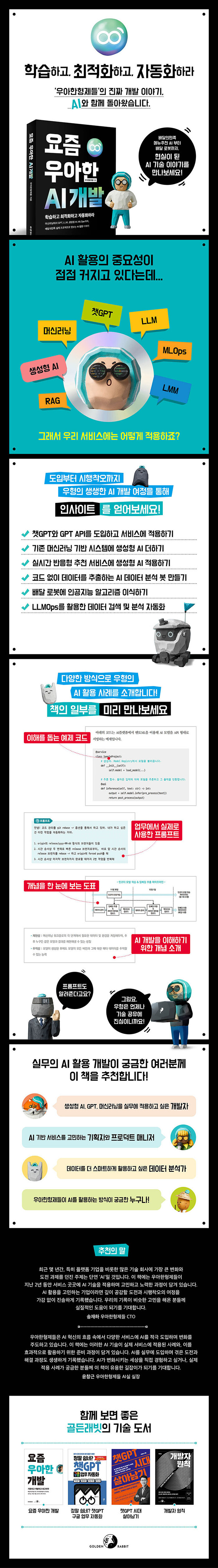 ÀÌ Ã¥Àº ¿ì¾ÆÇÑÇüÁ¦µéÀÌ ½ÇÁ¦ ÇÁ·ÎÁ§Æ®¿¡ Àû¿ëÇÑ AI ±â¼ú°ú °³¹ß °æÇèÀ» ´ã¾Æ³Â´Ù. AI ¸Þ´º Ãßõ ½Ã½ºÅÛºÎÅÍ µ¥ÀÌÅÍ °Ë»ö ¹× ºÐ¼® ÀÚµ¿È, ·Îº¿ ML ¸ðµ¨ °æ·®È¿Í MLOps ±¸Ãà±îÁö, ÃֽŠAI ±â¼úÀ» Ȱ¿ëÇÑ ½Ç¹« »ç·Ê¸¦ »ý»ýÇÏ°Ô ´Ù·é´Ù. AI¸¦ µµÀÔÇϰíÀÚ ÇÏ´Â ±âȹÀÚ¿Í °³¹ßÀÚ¶ó¸é, ½ÇÁ¦ ¼ºñ½º¿¡ AI ±â¼úÀ» ¾î¶»°Ô Àû¿ëÇÏ´ÂÁö ±Ã±ÝÇÏ´Ù¸é ¿ì¾ÆÇÑÇüÁ¦µéÀÌ °É¾î¿Â AI °³¹ßÀÇ ¿©Á¤À» ÅëÇØ ±× ÇØ´äÀ» ã¾Æº¸ÀÚ.