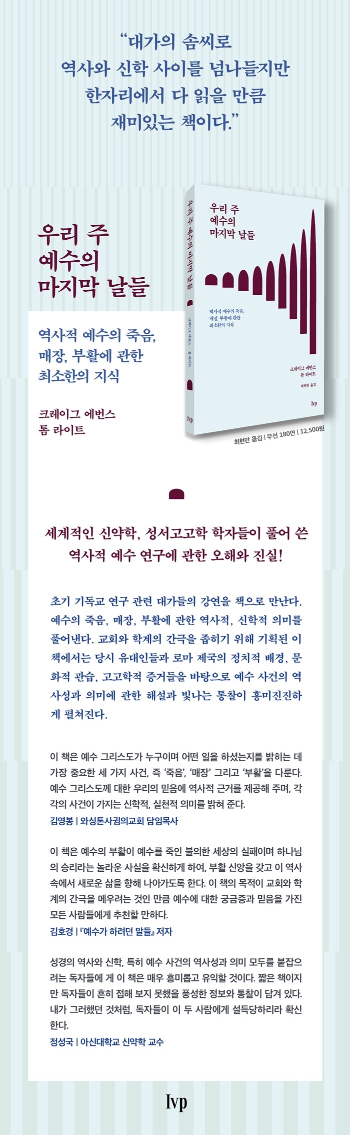 Ãʱ⠱⵶±³ ¿¬±¸ °ü·Ã ´ë°¡µéÀÇ °¿¬À» Ã¥À¸·Î ¸¸³´Ù. ±³È¸¿Í ÇаèÀÇ °£±ØÀ» Á¼È÷±â À§ÇØ ±âȹµÈ ÀÌ Ã¥¿¡¼´Â ¿¹¼öÀÇ Á×À½, ¸ÅÀå, ºÎȰ¿¡ °üÇÑ ¿ª»çÀû, ½ÅÇÐÀû Àǹ̸¦ Ç®¾î³½´Ù. ¿¹¼öÀÇ ¸¶Áö¸· ³¯µé¿¡ ´ëÇÑ ±íÀÌ ÀÖ´Â ºÐ¼®À» ½ÃµµÇÏ¿©, ´ç½Ã À¯´ëÀεé°ú ·Î¸¶ Á¦±¹ÀÇ Á¤Ä¡Àû ¹è°æ, ¹®ÈÀû °ü½À, °í°íÇÐÀû Áõ°ÅµéÀ» ¹ÙÅÁÀ¸·Î ¿¹¼ö »ç°ÇÀÇ ¿ª»ç¼º°ú Àǹ̿¡ °üÇÑ Ä£ÀýÇÑ ÇØ¼³°ú ½Å¼±ÇÑ ÅëÂûÀ» µé·ÁÁØ´Ù.