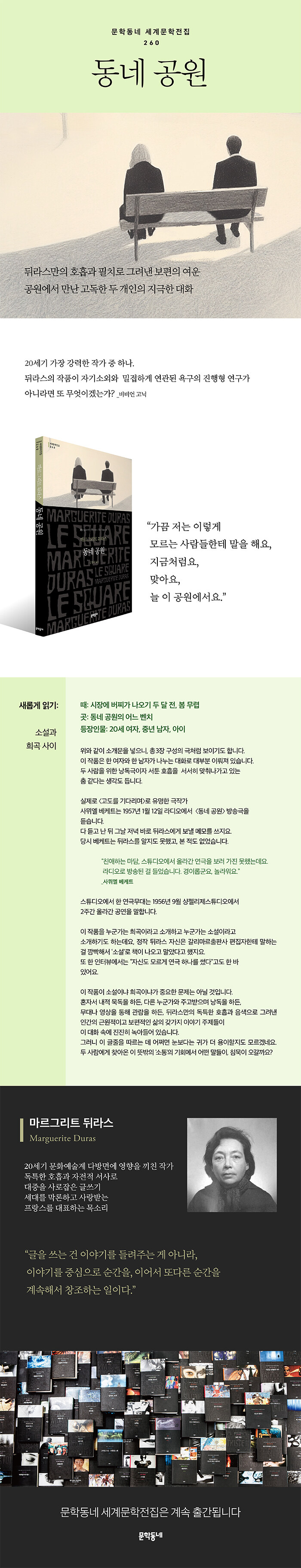 1955³â¿¡ ¹ßÇ¥ÇÑ ¡ºµ¿³× °ø¿ø¡»Àº ÀÛ°¡ÀÇ ÃʱâÀÛÀ¸·Î, ¼öÂ÷·Ê ¿¬±Ø ¹«´ë¿¡ ¿Ã·ÁÁ³´Ù. °¡Á¤ºÎ·Î ÀÏÇÏ´Â ½º¹« »ìÀÇ ¿©¼º°ú Çà»óÀ» ÇÏ¸ç ¶°µµ´Â Áß³âÀÇ ³²¼ºÀÌ °ø¿ø º¥Ä¡¿¡¼ ¿ì¿¬È÷ ¸¸³ª ³ª´©´Â ´ëÈ·Î ÀÌ·ïÁø ¼Ò¼³ÀÌ´Ù. ÀÏ»ó°ú Çູ, »î°ú Á÷¾÷, ¾Õ³¯¿¡ ´ëÇÑ ºÒ¾È°ú ±â´ë, ÇöÀçÀÇ °áÇ̰ú ¿å±¸ µî ¼·Î°¡ ¼·Î¿¡°Ô °Ç³×´Â °íµ¶ÇÑ ¸» ¼Ó¿¡¼ ¹Ì¾àÇÏÁö¸¸ ±Ù¿øÀûÀÎ À¯´ë°¡ ½Ïư´Ù.
