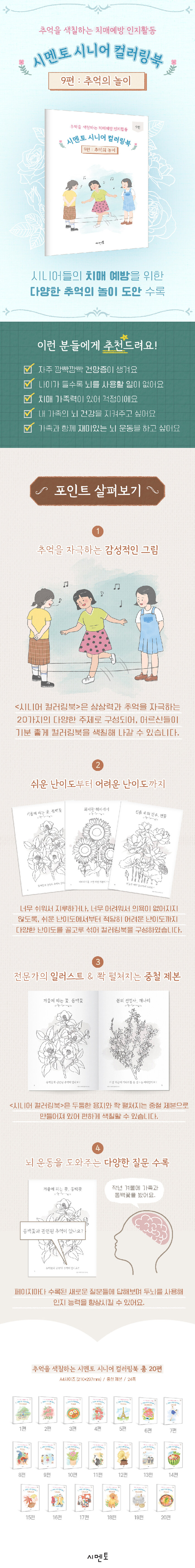 ÇູÇÏ°í °Ç°­ÇÑ ³ë³â±â¸¦ À§ÇØ ½Ã´Ï¾îµéÀÇ Ä¡¸Å ¿¹¹æÀ» µ½´Â Ä÷¯¸µºÏÀÌ´Ù. »ó»ó·Â°ú Ãß¾ïÀ» ÀÚ±ØÇÏ´Â 20°¡ÁöÀÇ ´Ù¾çÇÑ ÁÖÁ¦·Î ±¸¼ºµÇ¾î ¾î¸£½ÅµéÀÌ ±âºÐ ÁÁ°Ô Ä÷¯¸µºÏÀ» »öÄ¥ÇØ ³ª°¥ ¼ö ÀÖ´Ù. ¶ÇÇÑ ÆäÀÌÁö¸¶´Ù ¼ö·ÏµÈ ´Ù¾çÇÑ Áú¹®À» ÅëÇØ ³ú ¿îµ¿À» µµ¿Í ÀÎÁö ´É·ÂÀ» Çâ»ó½Ãų ¼ö ÀÖµµ·Ï ÇÏ¿´´Ù.