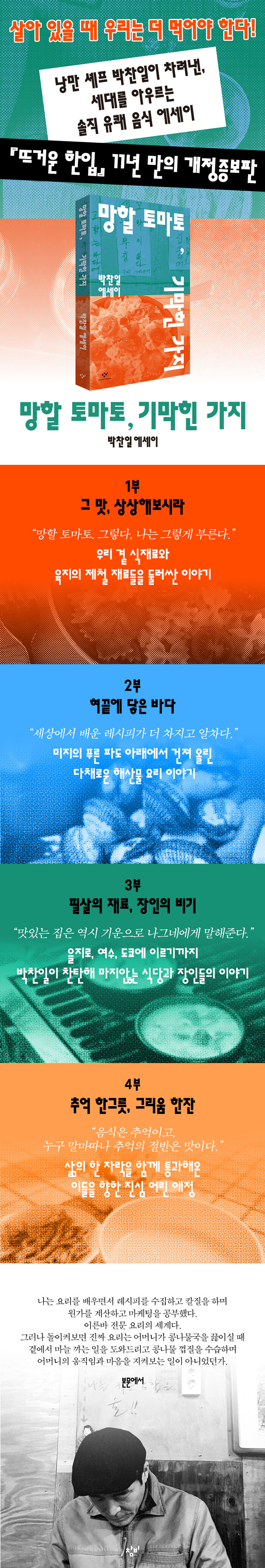 Á¦Ã¶ Àç·á¿Í ³ëÆ÷ÀÇ °¡Ä¡¸¦ Á¶¸íÇϰí, À½½Ä¿¡ ¾ôÈù Ãß¾ïÀ» »©¾î³ ¹®Àå·Â°ú Ź¿ùÇÑ ÀÔ´ãÀ¸·Î Ç®¾î³»¿Â ¡®±Û ¾²´Â ¿ä¸®»ç¡¯ ¹ÚÂùÀÏÀÇ À½½Ä ¿¡¼¼ÀÌ ¡º¸ÁÇÒ Å丶Åä, ±â¸·Èù °¡Áö¡»°¡ Ãâ°£µÇ¾ú´Ù. ¼¼»ó»ìÀ̸¦ ³Ê²öÈ÷ °ßµð°Ô ÇØÁØ ¸À±ò³ª´Â ¿ä¸®¿Í Ãß¾ïÀ» ´ãÀº ¡º¶ß°Å¿î ÇÑÀÔ¡»(âºñ 2014)ÀÇ 11³â ¸¸ÀÇ °³Á¤Áõº¸ÆÇÀ¸·Î, ±âÁ¸ ¿ø°í¸¦ ¼¼½ÉÈ÷ ´Ùµë°í »õ·Î¿î ¿¡ÇǼҵ带 ´õÇÏ¿© ÇÑÃþ ±í¾îÁø ¿ï¸²À¸·Î µ¶ÀÚµéÀ» ¸¸³´Ù.