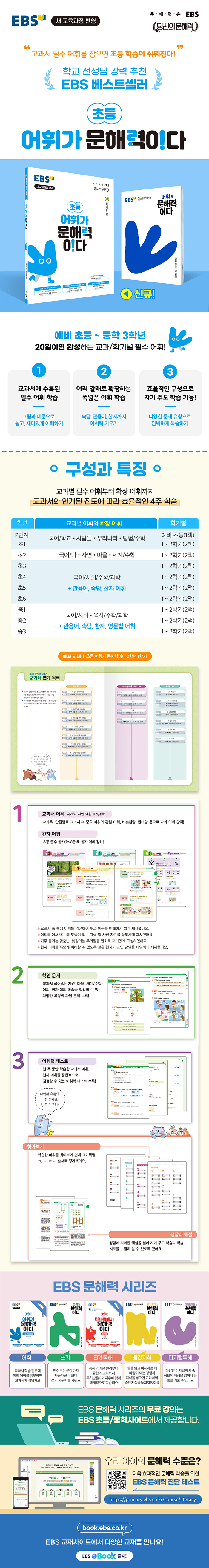¡®¾îÈÖ°¡ ¹®ÇØ·ÂÀÌ´Ù¡¯´Â ¿¹ºñ ÃʵîÀ» À§ÇÑ P´Ü°è, ±×¸®°í Ãʵî 1ÇгâºÎÅÍ ÁßÇÐ 3Çгâ±îÁö Çб⺰·Î ±¸¼ºµÇ¾î Çгâ°ú Çб⿡ µû¶ó ¼±ÅÃÇϸé ü°èÀûÀÎ ÇнÀÀÌ °¡´ÉÇÏ´Ù. ¡®±³°ú¼ ¿¬°è ¸ñ·Ï¡¯À» Á¦½ÃÇÏ¿© °ú¸ñº° ±³°ú¼ÀÇ ´Ü¿ø¸í¿¡ µû¶ó ÇнÀÇÒ ±³ÀçÀÇ ÂÊÀ» ÇÑ´«¿¡ ÆÄ¾ÇÇÒ ¼ö ÀÖ´Ù.