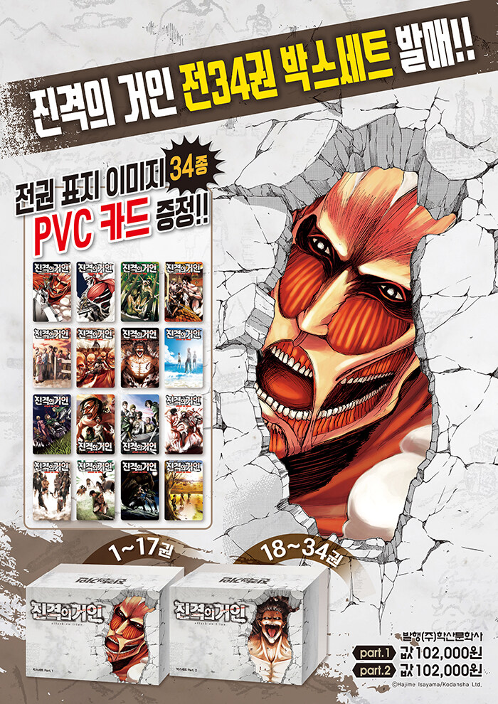 Áø°ÝÀÇ °ÅÀÎ Àü±Ç°ú Àü±Ç Ç¥Áö À̹ÌÁö PVCÄ«µå(ÃÑ 34¸Å)°¡ Æ÷ÇÔµÈ ¹Ú½º¼¼Æ®°¡ ¹ß¸ÅµÈ´Ù. 1~17±Ç°ú PVCÄ«µå 17¸Å°¡ Æ÷ÇÔµÈ Part.1, 18~34±Ç°ú PVCÄ«µå 17¸Å°¡ Æ÷ÇÔµÈ Part.2 Áø°ÝÀÇ °ÅÀÎ ÆÒÀ̶ó¸é ¹Ýµå½Ã ¼ÒÀåÇØ¾ß µÉ »óǰÀÌ´Ù. 1±Ç, 25±ÇÀÇ À̹ÌÁö¸¦ »ç¿ëÇÏ¿© °ÅÀÎÀÌ º®À» ¶Õ°í ³ª¿À´Â µíÇÑ À̹ÌÁö¸¦ Ç¥ÇöÇÑ µÎ °³ÀÇ ¹Ú½º¸¸À¸·Îµµ ¼ÒÀå °¡Ä¡´Â ´õ´õ¿í ¿Ã¶ó°¥ °ÍÀ¸·Î º¸ÀδÙ.