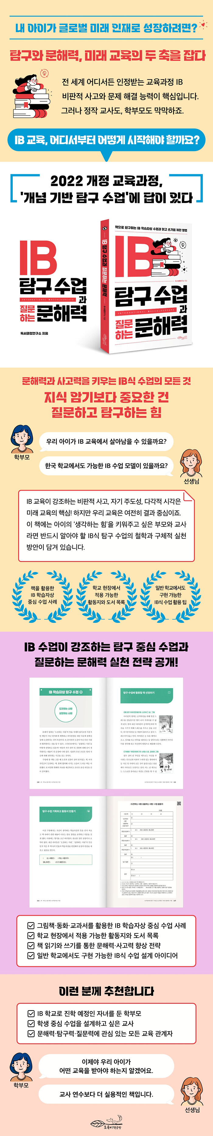 ÀÌ Ã¥Àº µ¶¼ ±³À°°ú IB¸¦ ¿À·§µ¿¾È ¿¬±¸ÇÏ°í ½ÇÃµÇØ ¿Â Àü¹®°¡µéÀÌ ÁýÇÊÇßÀ¸¸ç, ½ÇÁ¦ ¼ö¾÷ ÇöÀå¿¡¼ IB½ÄÀÇ Å½±¸ ¼ö¾÷À» ¾î¶»°Ô Àû¿ëÇØ ¿Ô´ÂÁö¸¦ ¹ÙÅÁÀ¸·Î ±¸¼ºµÇ¾ú´Ù. ƯÈ÷ IB Çб³°¡ ¾Æ´Ï´õ¶óµµ ÀÏ¹Ý Çб³¿¡¼ Ȱ¿ëÇÒ ¼ö ÀÖµµ·Ï ´Ù¾çÇÑ È°µ¿Áö¿Í ÁÖÁ¦º° µµ¼ ¸ñ·ÏÀ» ¼ö·ÏÇß´Ù. Çлýµé°ú ÇÔ²² ¸¸µé¾î°¡´Â ޱ¸ ¼ö¾÷¿¡ µû¶ó Ȱµ¿Áö¿Í µµ¼´Â ÀÚÀ¯·Ó°Ô º¯Çü °¡´ÉÇϵµ·Ï ¼³°èÇß´Ù.
