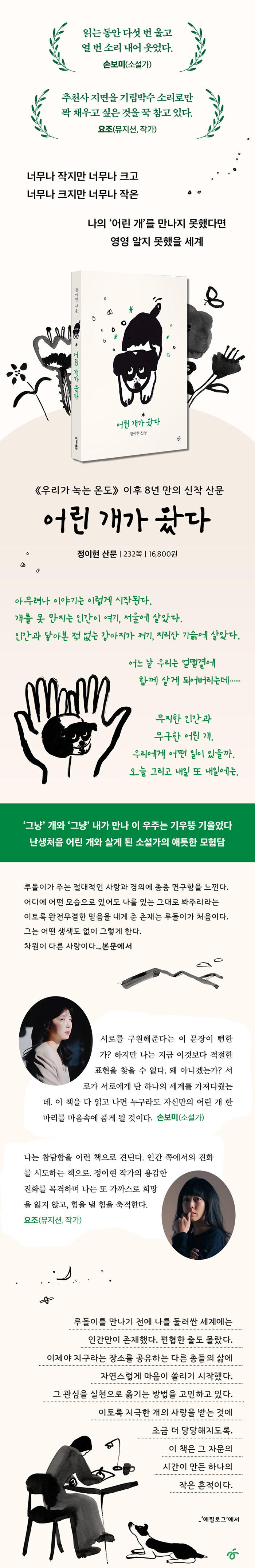 ±×·¯´Ù°¡ Àλý¿¡¼ ÀüÇô ¿¹»óÇÑ ¹Ù ¾ø´Â °³¸¦ Ű¿ì¸ç ÀڽŰú »ýȰ, ÀÏ»óÀÌ º¯ÈÇϰí, ±×·¸°Ô ¸¸³£ÇÑ ¡°Àý´ë ¼ø¼öÀÇ ¼¼°è¡±¸¦ ´Ù½Ã ±Û·Î ¾²¸é¼ Ä¡À¯¹Þ´Â ´À³¦ÀÌ µé¾ú´Ù´Â °ÍÀÌ´Ù. ÀÇÁöÀÇ »ê¹°ÀÌÀÚ »õ·Î¿î ´ÙÁü, ¿ë±âÀÇ Ç¥ÇöÀ̶ó´Â Ãø¸é¿¡¼ ¾î¸° °³¿Í ÇÔ²²ÇÑ ³ª³¯Àº ±× ÀÚü·Î ÀÛ°¡¿¡°Ô ÀüȯÁ¡ÀÌ µÈ ¼ÀÀÌ´Ù. ¡¶¾î¸° °³°¡ ¿Ô´Ù¡·ÀÇ ¡®¾î¸° °³¡¯´Â ¹ÙµÏÀ̶ó´Â ½Ç¹° °¾ÆÁö ¶Ç´Â ¹Ý·Áµ¿¹°¸¸ÀÌ ¾Æ´Ï¶ó ÀλýÀÇ ¿¹±âÄ¡ ¸øÇÑ, ÀÛÁö¸¸ Áß¿äÇÑ ÅÍ´×Æ÷ÀÎÆ®¸¦ »ó¡ÇÏ´Â ´Ü¾î´Ù. ´©±¸¿¡°Ô³ª ¾î¸° °³ÀÇ ¼ø°£Àº ¹Ýµå½Ã ¿Â´Ù°í ÀÛ°¡´Â ´ÙÁ¤ÇÏ°Ô ¸»ÇÑ´Ù. ºñ·Ï Áö±Ý ¾îµÓ°í Èû°Ü¿î ½Ã±â ÇѰ¡¿îµ¥ ÀÖ´Â µíÇÑ »ý°¢ÀÌ µé ¶§Á¶Â÷ ±× ¼ø°£Àº ¿À°í ÀÖÀ»Áöµµ ¸ð¸¥´Ù°í. ÀÛ°¡°¡ ¸ö¼Ò üµæÇÑ ³«°üÀ¸·Î ºû³ª´Â ÀÌ Ã¥À» ´Ù ÀÐ°í ³ª¸é ¿ì¸®´Â ÀڽŸ¸ÀÇ ¡®¾î¸° °³¡¯°¡ ¹«¾ùÀÎÁö °õ°õ »ý°¢Çغ¼ °ÍÀÌ´Ù.