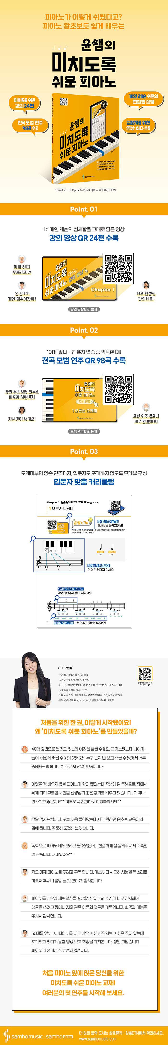 ¿ÕÃʺ¸¸¦ À§ÇÑ QR °ÀÇ ¿µ»ó 24Æí°ú Àü°î ¸ð¹ü ¿¬ÁÖ 98°îÀ» ¼ö·ÏÇÑ ¡º¹ÌÄ¡µµ·Ï ½¬¿î ÇǾƳ롻´Â óÀ½ ÇǾƳ븦 ¹è¿ì´Â »ç¶÷µµ È¥ÀÚ¼ Â÷±ÙÂ÷±Ù ÀÍÈú ¼ö ÀÖµµ·Ï ±¸¼ºµÈ ÀÔ¹®ÀÚ ¸ÂÃã ±³Àç´Ù. °Ç¹Ý ±×¸², ¼Õ°¡¶ô ¹øÈ£, ¹ÚÀÚ ¼¼±â(¡®Çϳª, µÑ, ¼Â, ³Ý¡¯)±îÁö ¾Çº¸ ¾Æ·¡¿¡ Á÷°üÀûÀ¸·Î Á¦½ÃÇØ ´©±¸³ª ½±°Ô µû¶óÄ¥ ¼ö ÀÖÀ¸¸ç, À±½ÜÀÇ µû¶æÇÑ ·¹½¼ Åæ°ú Ä£ÀýÇÑ ¿¬ÁÖ ÆÁÀº ¸¶Ä¡ ¿·¿¡¼ Á÷Á¢ ¾Ë·ÁÁÖ´Â µíÇÑ 1:1 °³ÀÎ ·¹½¼À» ¹Þ´ÂµíÇÑ ´À³¦À» ÁØ´Ù.