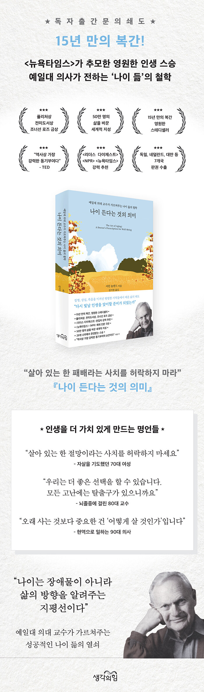 ÀúÀÚ´Â ¡°³ªÀÌ µç´Ù´Â °ÍÀº Ãູ¡±À̶ó°í È®½ÅÇÑ´Ù. ÀþÀº ½ÃÀýº¸´Ù ´õ ³ª¾ÆÁø ¾È¸ñÀ¸·Î »îÀ» °üÁ¶ÇÒ ¼ö ÀÖÀ» »Ó ¾Æ´Ï¶ó, ÀÇÇÐÀûÀ¸·Îµµ ¿ì¸® µÎ³ú´Â ½Ã°£ÀÌ Áö³¯¼ö·Ï ´õ Çö¸íÇØÁö±â ¶§¹®ÀÌ´Ù. ÀÌ ¾Æ¸§´Ù¿î ½Ã¼±ÀÇ ÀüȯÀÌ µ¶ÀÚµéÀÌ ÀÌ Ã¥À» °è¼Ó ã°Ô ÇÏ´Â ÈûÀÏ °ÍÀÌ´Ù. Ãʰí·É»çȸ°¡ µÈ Çѱ¹¿¡¼ ¿ì¸®´Â ¼º°øÀûÀÎ ³ë³âÀ» º¸³»¾ß ÇÏ´Â °úÁ¦¿¡ Ã³ÇØ ÀÖ´Ù. ½Ã´ë°¡ ¹Ù²î¾îµµ °øÅëÀûÀ¸·Î Àû¿ëµÇ´Â ÁöÇý°¡ ´ã±ä ÀÌ ºÒ¸êÀÇ °íÀüÀÌ ¿ì¸®¿¡°Ô ³²Àº ½Ã°£À» ´õ ÇູÇÏ°Ô »ç´Â ºñ¹ÐÀ» ÀüÇØÁÙ °ÍÀÌ´Ù.