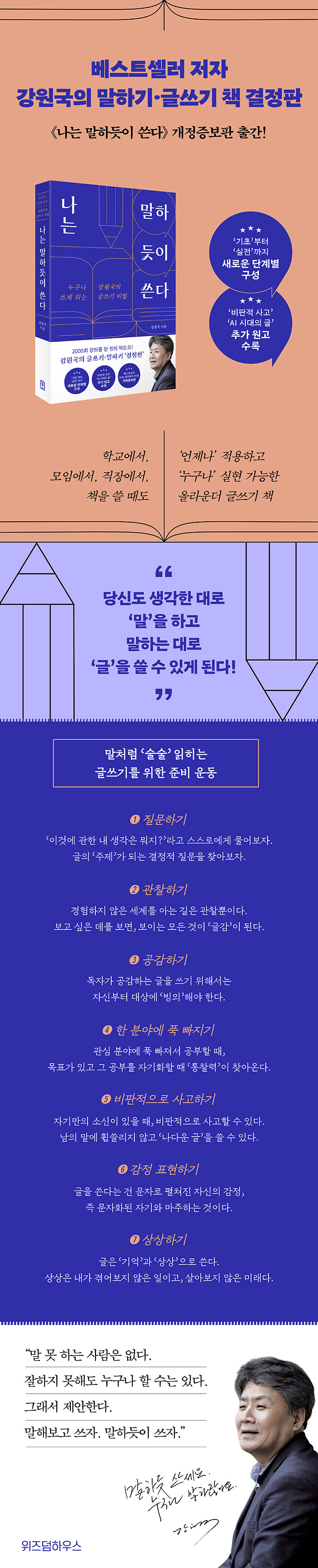 ÀÌ Ã¥À» ÅëÇØ ±Û°ú ¸»¿¡ ¼Å÷ ´©±¸¶óµµ ±âÃʺÎÅÍ ½ÇÀü±îÁö µû¶ó°¡ º¸¸é, ¾î¶² ±ÛÀÌµç ¾²±â°¡ ÇÑ°á ¼ö¿ùÇØÁø´Ù. ´Ù ÀÐÀ» ½Ã°£ÀÌ ¾ø´Ù¸é, ÀÔ¸À¿¡ ¸Â´Â 󹿏¸ µû·Î Àо µÈ´Ù. ¸» ±×´ë·Î ¡®¿Ã¶ó¿î´õ ±Û¾²±â Ã¥¡¯ÀÌ´Ï ¾îµð¸¦ ¸ÕÀú º¸°Ç »ó°ü¾ø´Ù. ƯÈ÷³ª 5³â ¸¸¿¡ °³Á¤ÇÑ À̹ø Áõº¸ÆÇ¿¡¼´Â ¡®±âº»±â-µµ±¸-ÈÆ·Ã-½ÇÀü¡¯ ¼øÀ¸·Î ¸ñÂ÷¿Í º»¹®À» À籸¼ºÇϰí, ¿¹½ÃµéÀ» º¸¿ÏÇß´Ù. »õ·Î¿î ¿ø°í ¡®ºñÆÇÀû »ç°í¡¯¿Í ¡¯AI ½Ã´ë °¡Àå Àΰ£´ä°Ô »ç´Â ¹æ¹ý¡¯À¸·Î ±Û¾²±â¿¡ ´ëÇÑ ÀÌÇØ¸¦ µµ¿ì¸ç, ¼ÒÀ强 ³ôÀº »õ·Î¿î Ç¥Áö¿Í ÆÇÇüÀ¸·Î µ¶ÀÚµéÀ» ã¾Æ°£´Ù.