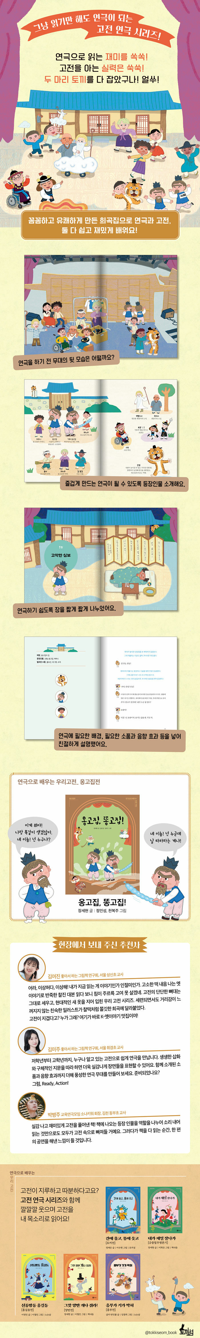 ¡®¿¬±ØÀ¸·Î ¹è¿ì´Â ¿ì¸®°íÀü ½Ã¸®Á´Â ´Ù¾çÇÑ °íÀüÀ» ±íÀÌ ÀÖ°Ô ¾Ë ¼ö ÀÖµµ·Ï ¿¬±¸Çϰí, ÁýÇÊÇß½À´Ï´Ù. ÆÇ¼Ò¸®°è ¼Ò¼³ÀÎ ¡¶ÈïºÎÀü¡·À» °¢»öÇÑ¡¶ÈïºÎ°¡ ±â°¡ ¸·Çô¡·¿¡´Â ÆÇ¼Ò¸®¸¦ Ȱ¿ëÇÑ ´ë»ç°¡ ³ª¿À°í, À½Çâ È¿°ú·Îµµ ÆÇ¼Ò¸®¸¦ ¾²µµ·Ï ¸¸µé¾ú½À´Ï´Ù. ¾ÆÀ̵éÀÌ ¿¬±ØÀ» ÇÏ¸ç °°Àº ºÎºÐÀÇ ³»¿ë¿¡¼ ÆÇ¼Ò¸®´Â ¾î¶»°Ô Ç¥ÇöÇÏ´ÂÁö ¾Ë ¼ö ÀÖÁö¿ä. ¡¶±ÔÁßÄ¥¿ìÀï·Ð±â¡·¸¦ °¢»öÇÑ¡¶³»°¡ Á¦ÀÏ Àß³ª°¡¡·¿¡´Â ºÀ»êÅ»Ãã¿¡¼ ¾ç¹ÝÀÇ ¹«´ÉÀ» ºñ²¿´Â ¿ªÇÒÀ» ÇÏ´Â ¸»¶ÒÀÌ¿Í ÈïÀ» µ¸¿ì´Â »ç¹°³îÀÌÆÐ°¡ µîÀåÇϰí, ¡¶¾ç¹ÝÀü¡·¸¦ °¢»öÇÑ¡¶±×±ö ¾ç¹Ý °³³ª Áà¶ó!¡·¿¡¼´Â ÃÊ·©À̰¡ ±ØÀ» ²ø¾î°©´Ï´Ù. °íÀü°ú ¿¬±Ø µÎ À帣¿¡ Å»ÃãÀ̶ó´Â »õ·Î¿î À帣±îÁö ¹è¿ï ¼ö ÀÖÁö¿ä. ¶Ç ¸ðµç ½Ã¸®Áî ¸¶Áö¸·¿¡´Â °¢ ÀÛǰÀÌ °¡Áø ¹è°æ°ú Àṉ̀îÁö ²Ä²ÄÇÏ°Ô ½Ç¾ú½À´Ï´Ù. ÀÌÁ¦ ¡®¿¬±ØÀ¸·Î ¹è¿ì´Â ¿ì¸® °íÀü¡¯ ½Ã¸®Áî·Î °íÀüÀ» ´Ùä·Ó°Ô ÀÐ¾î º¸¼¼¿ä!