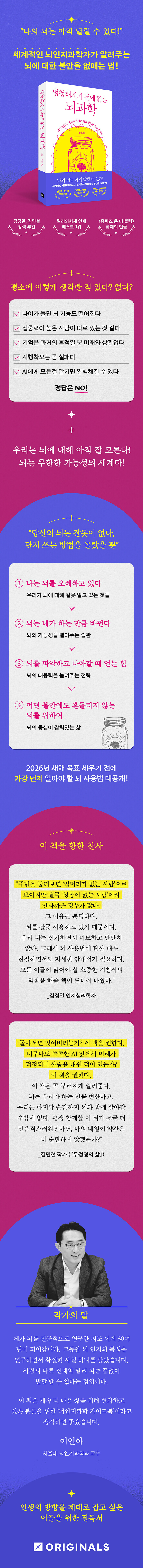 ¡®¿Ö ÁýÁ߷°ú ±â¾ï·ÂÀÌ ¿¹Àü¸¸ ¸øÇÏÁö?¡¯¶ó´Â °í¹ÎÀº ³ªÀÌ¿Í »ó°ü¾øÀÌ ÀλýÀ» »ì¾Æ°¡¸ç °è¼ÓµÈ´Ù. Àλý¿¡´Â ÇнÀÇÏ°í ´Þ¼ºÇØ¾ß ÇÒ °ÍµéÀÌ °÷°÷¿¡ ³õ¿© ÀÖ°í ±×¶§¸¶´Ù ÀÚ½ÅÀÇ ÇѰ踦 ´À³¥ ¼ö¹Û¿¡ ¾ø´Ù. ±×·¯³ª ³ú¿¡ ¼û°ÜÁø Áø½ÇÀ» ¾Æ´Â »ç¶÷Àº ±× ´ëó¹ýÀÌ ´Ù¸£´Ù. ³ú´Â °è¼Ó ½ÃµµÇÏ°í º¯ÈÇϵµ·Ï ¸¸µé¾îÁø ½Ã½ºÅÛÀÌ´Ù. ±×µ¿¾È °®°í ÀÖ´ø ³ú¿¡ ´ëÇÑ À߸øµÈ ¼±ÀÔ°ßÀ» ¾ø¾Ö°í ±àÁ¤Àû °¡´É¼ºÀ» ¹ß°ßÇÏ´Â °Í¸¸À¸·Îµµ Áö±ÝÀÇ ºÒÇÊ¿äÇÑ ºÒ¾ÈÀÌ »ç¶óÁú °ÍÀÌ´Ù. ³úÀÎÁö°úÇÐ ¿¬±¸ÀÇ ÃÖÀü¼±¿¡¼ ¡®±â¾ï°ú ¸Á°¢¡¯ÀÇ ½Åºñ¸¦ ÁýÁßÀûÀ¸·Î ÆÄÇìÄ¡°í ÀÖ´Â ÀÌÀÎ¾Æ ±³¼ö°¡ ¡®³úÀÇ ¹«±Ã¹«ÁøÇÑ °¡´É¼ºÀÇ ¼¼°è¡¯·Î ¾È³»ÇÑ´Ù. ÀÌÁ¦ºÎÅÍ¶óµµ ³ú¸¦ À§ÇÑ ½À°üÀ» Çϳª¾¿ »î¿¡ µé¿©º¸ÀÚ. ±× »ç¼ÒÇÑ º¯È¸¦ ÅëÇØ ¹«±â·ÂÇÑ Àϻ󿡼 ¹þ¾î³ª »îÀÇ ÁÖµµ±ÇÀ» Áã´Â ÀÚ½ÅÀ» ¹ß°ßÇÏ°Ô µÉ °ÍÀÌ´Ù.