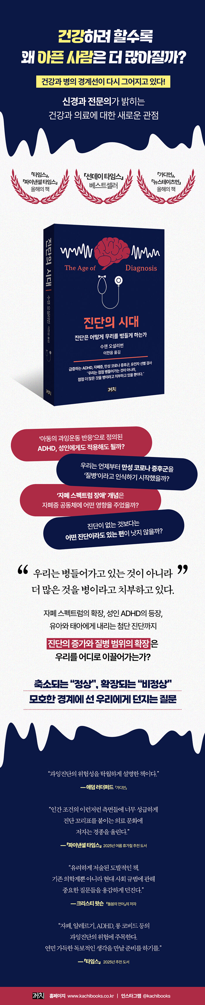 ADHD, ÀÚÆóÁõ, ¸¸¼º ÁõÈıºÀÌ Çö´ëÀÎÀ» ±«·ÓÈ÷°í ÀÖ´Ù. À̵é ÁúȯÀÇ ¹ßº´·üÀÌ Áõ°¡Çϰí ÀÖ´Ù´Â ±â»ç´Â ´õ ÀÌ»ó Ãæ°ÝÀûÀÌÁö ¾ÊÀ¸¸ç, ÀÌ·± ÁúȯÀº ÀÌÁ¦ ¿ì¸®ÀÇ ÀÏ»óÀûÀÎ ´ëÈÀÇ ÁÖÁ¦À̱⵵ ÇÏ´Ù. 30³â ³Ñ°Ô ȯÀÚµéÀ» Áø·áÇØ¿Â ½Å°æ°ú ÀÇ»çÀÎ ÀúÀÚ ¿ª½Ã ÀÌ¹Ì ¼³Ê °¡Áö°¡ ³Ñ´Â ¸¸¼ºÁúȯÀ» ¾Î°í ÀÖ´Ù´Â Áø´ÜÀ» ¹ÞÀº »óÅ¿¡¼ ÀÚ½ÅÀ» ã¾Æ¿À´Â ÀþÀºÀ̵éÀÌ ÃÖ±Ù µé¾î Á¡Á¡ ´Ã¾î³ª°í ÀÖ´Ù´Â »ç½ÇÀ» ÀÚ°¢ÇÏ°Ô µÈ´Ù. ÀúÀÚ´Â ¿ì¸®°¡ ÷´Ü °úÇÐÀÇ ¹ßÀü°ú °Ç°¿¡ ´ëÇÑ »çȸÀû ºÐÀ§±âÀÇ º¯È·Î ÀÎÇØ¼ ³Ê¹« ¸¹Àº Áø´Ü, Áï °úÀ×Áø´ÜÀÇ ½Ã´ë¿¡ »ì°í ÀÖ´Â °ÍÀº ¾Æ´ÑÁö Àǹ®À» Á¦±âÇϸç, ÀÇÇÐÀû Áø´ÜÀÌ Á¤È®ÇÏ°Ô ¾î¶² °ÍÀ̰í, Áø´ÜÀ» ¹ÞÀº »ç¶÷¿¡°Ô ¹«½¼ Àǹ̰¡ µÇ¾î¾ß ÇÏ´ÂÁö¸¦ ÁøÁöÇÏ°Ô °í¹ÎÇÒ °ÍÀ» Ã˱¸ÇÑ´Ù. Áø´ÜÀ» µÑ·¯½Ñ ¡°Á¤»ó¡±°ú ¡°ºñÁ¤»ó¡±ÀÇ °æ°è°¡ ³Ê¹« ¸ðÈ£ÇÑ °æ¿ì°¡ ¸¹Àº µ¥´Ù°¡, Á¡Á¡ ¡°Á¤»ó¡±ÀÇ ¹üÀ§´Â Ãà¼ÒµÇ°í ¡°ºñÁ¤»ó¡±ÀÇ ¹üÀ§´Â È®ÀåµÇ°í ÀÖ´Ù´Â ÀúÀÚÀÇ ½Ã°¢Àº ÀÇÇÐ Áø´Ü¿¡ ´ëÇØ¼ ¸¹Àº ½Ã»çÁ¡À» ¾È°ÜÁØ´Ù. ÀúÀÚ´Â ÀÇÇÐ Áø´ÜÀÌ ½ÇÁ¦·Î´Â Á¤½Å, ½ÅüÀû Áõ»óÀ» ¼¼½ÉÇÏ°Ô °æÃ»ÇÏ´Â °æÇèÀÌ Ç³ºÎÇÑ Àǻ簡 ³»¸®´Â ÀÓ»ó ±â¿¹ÀÓÀ» ºÐ¸íÈ÷ ÇÑ´Ù. Áø´ÜÀÇ ±âÁØÀÌ µÇ´Â Á¤È®ÇÑ ¼öÄ¡ ¶ÇÇÑ ÇÕÀÇ·Î °áÁ¤µÈ´Ù. ¿äÁò ¸¹Àº »ç¶÷µéÀÌ ÁÖ¸ñÇÏ´Â Ç÷´ç ¿ª½Ã ¸¶Âù°¡ÁöÀÌ´Ù. ´ç´¢º´ Àü ´Ü°è¸¦ ±¸ºÐÇÏ´Â ±âÁØÀÌ µÇ´Â Ç÷´ç ¼öÄ¡¸¦ Á¶±Ý¸¸ Á¶Á¤ÇÏ´õ¶óµµ ¾öû³ ¼öÀÇ »ç¶÷ÀÌ ÇÏ·ç¾ÆÄ§¿¡ °©Àڱ⠴索º´À» °ÆÁ¤ÇØ¾ß Çϴ óÁö¿¡ ³»¸ô¸°´Ù. ÀúÀÚ´Â ÀÌ·¸µí Áúº´ÀÇ Á¤ÀǸ¦ È®ÀåÇÔÀ¸·Î½á »ç¶÷µéÀÌ ¾Æ¹«·± ÇýÅõµ ¾øÀÌ ºÒÇÊ¿äÇÑ Ä¡·á¸¸ ¹Þ°Ô µÇ´Â °ÍÀº ¾Æ´ÑÁö ¿ì·ÁÇÑ´Ù.