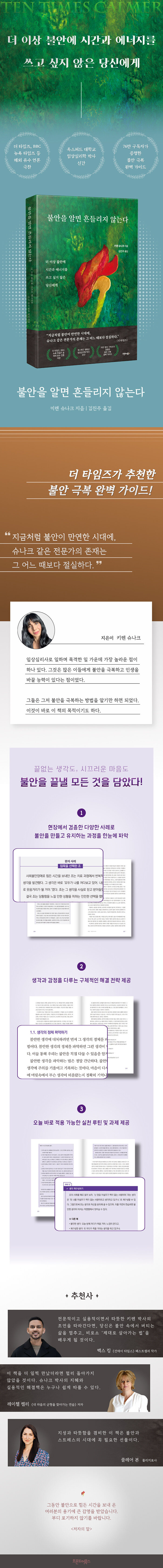 ÀÌ¿¡ ¡¶ºÒ¾ÈÀ» ¾Ë¸é Èçµé¸®Áö ¾Ê´Â´Ù¡·¿¡¼´Â ¿ì¸® ³»¸éÀÇ ºÒ¾ÈÀÌ ¹«¾ùÀ» °è±â·Î ź»ýÇϰí, ¾î¶»°Ô ¼ºÀåÇÏ¿© ¿ì¸®¸¦ À§ÇùÇϴ°¡¿¡ °üÇÑ ¼³¸íÀ¸·Î ³íÀÇÀÇ ÁÖÃåµ¹À» ½×´Â´Ù. µ¿½Ã¿¡ ÀÌ·ÐÀû ÀÌÇØ¸¦ ³Ñ¾î ºÒ¾ÈÀ» ´Ù½º¸®´Â ÇÙ½ÉÀÎ ºÒ¾È ¼ö¿ë°ú À¯¿¬¼º ±â¹ýÀ» ±¸Ã¼ÀûÀ¸·Î Ç®¾î³½´Ù. ÀÌ»Ó ¾Æ´Ï¶ó ´Ù¾çÇÑ È¯ÀÚÀÇ »ç·Ê·Î ºÒ¾ÈÀå¾ÖÀÇ ´Ù¾çÇÑ ¸ð½À°ú Áõ»óÀº ¹°·Ð, ÀÏ»ó ¼Ó¿¡¼ ºÒ¾ÈÀ» ´Ù½º¸®´Â ±â¹ý°ú ±× È¿°ú¸¦ ½ÇÁõÀûÀ¸·Î Á¦½ÃÇÑ´Ù. 20³â ÀÌ»óÀÇ °æ·ÂÀ» ÀÚ¶ûÇÏ´Â ÀúÀÚÀÇ ÇöÀå °æÇè°ú ½É¸®ÇÐ ¿¬±¸°¡ ¾î¿ì·¯Áø ÀÌ Ã¥Àº ½Ã´ëÀÇ °Ý·ù¸¦ Ÿ°í ³ª³¯ÀÌ °ÇØÁö´Â ºÒ¾È¿¡ ÁöÄ£ Çö´ëÀο¡°Ô Àý¸ÁÀ» °ÅµÎ°í ´Ù½Ã »ì¾Æ°¥ ÈûÀ» °Ç³×´Â ¾È³»¼°¡ µÉ °ÍÀÌ´Ù. ¡¶ºÒ¾ÈÀ» ¾Ë¸é Èçµé¸®Áö ¾Ê´Â´Ù¡·¿¡´Â ´ç½ÅÀÇ ¸¶À½ÀÌ ¹«³ÊÁ® °¥ ¶§, »îÀÇ ÁÖü¸¦ ºÒ¾ÈÀÌ ¾Æ´Ñ ´ç½ÅÀ¸·Î ´Ù½Ã ¼¼¿ï ±¸Ã¼ÀûÀÌ°í ½ÇõÀûÀÎ ÀúÀÚÀÇ ÅëÂûÀ» ¸Ó±Ý°í ÀÖ´Ù.