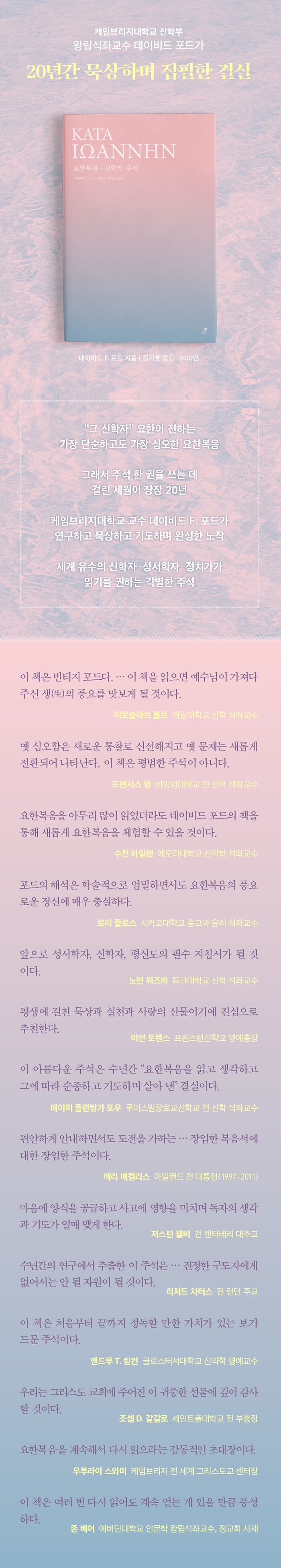 µ¥À̺ñµå Æ÷µå´Â °æÀÌ·Î¿î ½ÅÇÐÀû ¼º°æ ÇØ¼®À» º¸¿© ÁØ´Ù. ±×ÀÇ ÁÖ¼®Àº öµÎö¹ÌÇÏ°Ô ¼®ÀÇÀû¡¤ºñÆòÀû ÀïÁ¡¿¡ Á¤ÅëÇϸ鼵µ, Çϳª´Ô°ú ¸ðµç ½ÇÀç¶ó´Â ÁöÆò ¾È¿¡¼ ¿äÇѺ¹À½ÀÇ ÇÙ½É ÁÖÁ¦ÀÎ ÀǹÌ, »î, »ç¶û¿¡ ÃÊÁ¡À» ¸ÂÃá´Ù. ¿äÇÑÀÇ Ã¢ÀÇÀûÀÎ ±×¸®½ºµµ·ÐÀû ¼º°æ ÇØ¼®°ú °ø°üº¹À½ ÇØ¼®Àº Æ÷µå¿¡°Ô ÀÌ º¹À½¼¸¦ ÀÐ°í ´Ù½Ã Àбâ À§ÇÑ ÇϳªÀÇ ¸ðµ¨ÀÌ µÇ¾î ÁØ´Ù. ±×°¡ ÅëÂû·Â°ú »ó»ó·ÂÀ» °âºñÇÏ¿© ÅØ½ºÆ®¸¦ ´Ù·é °ÍÀº ±¸¼ºÀûÀ̰í Ž»öÀûÀÎ Çö´ëÀÇ ½ÅÇÐÀû ¼ºÂû°ú ¼·Î ¿µÇâÀ» ÁÖ°í¹ÞÀº °ÍÀÌ´Ù. ÀÌ º¹À½¼ÀÇ Èı⠼ö¿ë, ½Ã, Á¾±³ °£ ´ëÈ, ±×¸®°í º¹À½ÀÇ ±â»Ý°ú ½½Çİú ¸ðÈ£ÇÔ°ú ´õºÒ¾î »ç´Â ±×¸®½ºµµÀÎÀÇ »î ¶ÇÇÑ ÀÌ·¯ÇÑ ¼ºÂûÀÌ Ç¥ÇöµÇ´Â ¹æ½Ä¿¡ ÀÏÁ¶ÇÑ´Ù. Æ÷µåÀÇ ¸íÈ®ÇÏ°í ´ÜµµÁ÷ÀÔÀûÀ̸ç Á¤¿ÀûÀÎ ½ºÅ¸ÀÏÀº ÀÌ º¹À½¼°¡ Á¦½ÃÇÏ´Â »îÀÇ º¯È °¡´É¼ºÀ» ¹÷Â÷¿À¸£°Ô Àü´ÞÇÑ´Ù. ¶ÇÇÑ µ¶ÀÚ°¡ º¹À½¼ ÀúÀÚÀÇ Áõ°Å¿¡ Âü¿©ÇÏ¸é¼ ¼º·ÉÀ» ÅëÇØ ±×¸®½ºµµÀÇ ÀÓÀç¿¡µµ Âü¿©Çϰí ÀÖÀ½À» ´À³¥ ¼ö ÀÖ°Ô²û µ½´Â´Ù. µ¶ÀÚµéÀº ºÐ¸í ƯÁ¤ ±¸Àý¿¡ ´ëÇØ ÅëÂûÀ» ¾òÀ¸·Á°í ÀÌ ÁÖ¼®À» ã¾Æº¼ °ÍÀÌ´Ù. ÇÏÁö¸¸ ÀÌ Ã¥Àº óÀ½ºÎÅÍ ³¡±îÁö Á¤µ¶ÇÒ ¸¸ÇÑ °¡Ä¡°¡ ÀÖ´Â º¸±â µå¹® ÁÖ¼®ÀÌ´Ù.