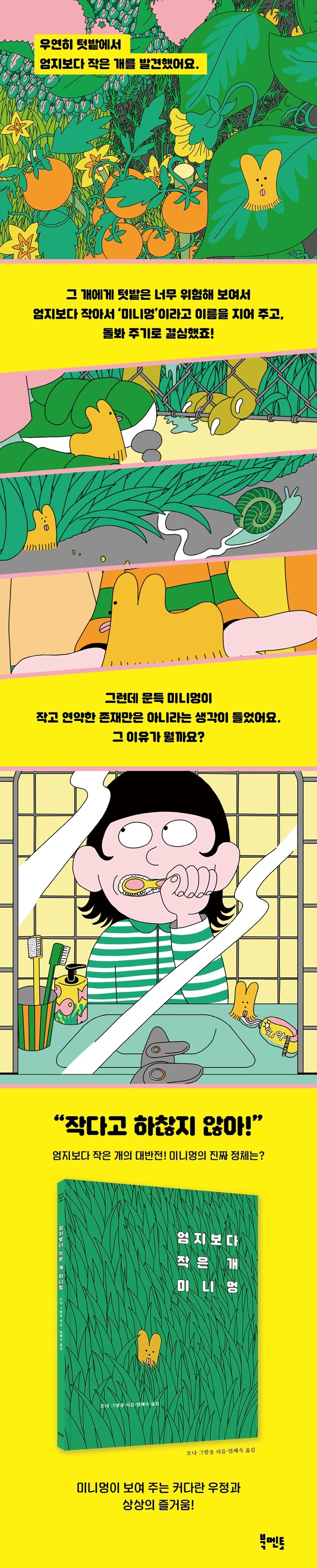 ¡¶¾öÁöº¸´Ù ÀÛÀº °³ ¹Ì´Ï¸Û¡·Àº µ¹º½°ú Ã¥ÀÓ°¨ÀÌ ÁÖ´Â ÇູÀ» È·ÁÇÑ ±×¸²°ú ±ô¦ ¹ÝÀüÀ¸·Î À¯ÄèÇÏ°Ô Ç®¾î³½ ±×¸²Ã¥ÀÌ¿¡¿ä. ÅԹ翡¼ ¿ì¿¬È÷ ¾öÁöº¸´Ù ÀÛÀº °³¸¦ ¹ß°ßÇÑ ¾ÆÀÌ. ¾ÆÀÌ´Â ±× ÀÛÀº °³°¡ Á» ¿ì½º²Î½º·´°Ô »ý°åÁö¸¸, ±×·¡µµ ±× °³¸¦ µ¹º¸±â·Î °á½ÉÇß¾î¿ä. ±×´ë·Î µÎ¸é °Å¹Ì¿¡°Ô Àâ¾Æ¸ÔÈ÷°Å³ª ¾ö¸¶ ¹ß¿¡ ¹âÈúÁöµµ ¸ð¸¥´Ù°í »ý°¢Ç߰ŵç¿ä. ¾ÆÀÌ´Â ¾öÁöº¸´Ù ÀÛÀº °³¿¡°Ô ¡®¹Ì´Ï¸Û¡¯À̶ó´Â À̸§µµ Áö¾î ÁÖ°í, ¼¼½ÉÈ÷ ¹Ì´Ï¸ÛÀ» µ¹ºÃÁö¿ä. ±×·¯´ø ¾î´À ³¯ ¾ÆÀÌ´Â ÀÌ ÀÛ°í ¿¬¾àÇÒ °Í¸¸ °°Àº ¹Ì´Ï¸ÛÀÌ ¾î¼¸é ÀڱⰡ »ý°¢ÇÏ´Â °Í°ú ´Þ¸® ¾ÆÁÖ ¶È¶ÈÇÑ Á¸ÀçÀÏÁöµµ ¸ð¸¥´Ù°í »ý°¢ÇÏ°Ô µÇ¾ú¾î¿ä. ¾ÆÀÌ´Â ¿Ö ±×·± »ý°¢À» ÇÏ°Ô µÈ °É±î¿ä? ¾ÆÀÌÀÇ »ý°¢´ë·Î ¹Ì´Ï¸ÛÀº ±×Àú ÀÛ°í ¿¬¾àÇÑ ÀÛÀº °³°¡ ¾Æ´Ñ °É±î¿ä?