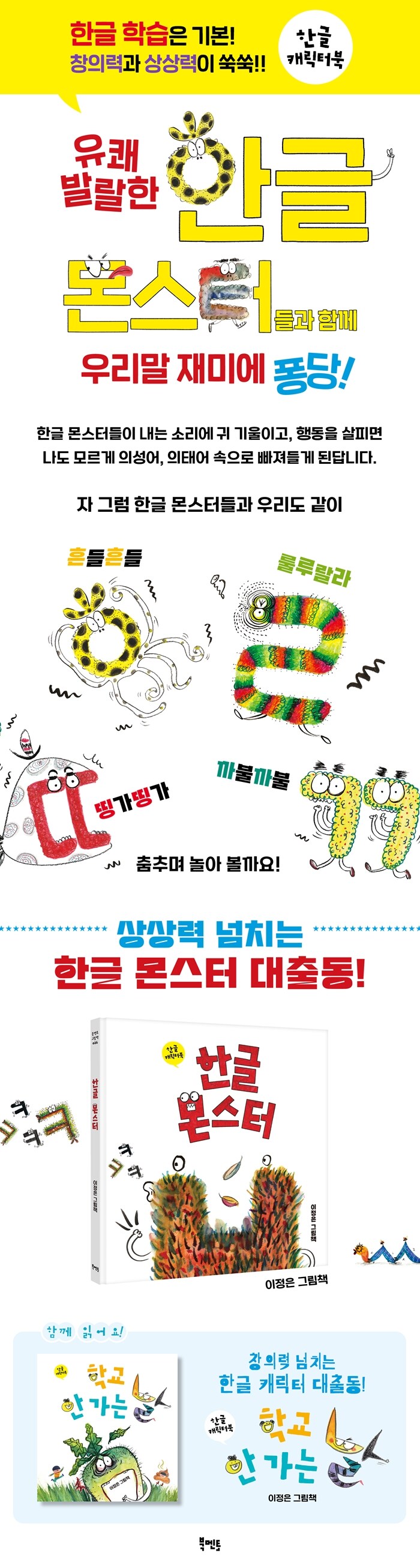 ¡¶ÇÑ±Û ¸ó½ºÅÍ¡· ±×¸²Ã¥Àº ÇÑ±Û Ä³¸¯ÅͺÏÀÌ¿¡¿ä. ÇÑ±Û Ä³¸¯ÅͺÏÀ̶õ, ÇѱÛÀ» ij¸¯ÅÍÈ ÇÏ¿© ¾î¸°À̵éÀÌ ½±°í Àç¹Ì³ª°Ô ÇѱÛÀ» ÀÍÈú ¼ö ÀÖµµ·Ï ¸¸µç Ã¥À̶ø´Ï´Ù. ±ÛÀÚ¿Í ±×¸²ÀÌ À¯±âÀûÀ¸·Î °áÇÕÇÑ ÇÑ±Û Ä³¸¯ÅÍ´Â ¾ÆÀ̵鿡°Ô ½Ã°¢ÀûÀ¸·Î Áñ°Å¿òÀ» Áܰú µ¿½Ã¿¡ Çѱۿ¡ ´ëÇÑ ÀÌÇØ¸¦ ³ô¿© ÁÝ´Ï´Ù. ¶ÇÇÑ, »ó»ó·Â ³ÑÄ¡°í âÀÇÀûÀÎ ÇÑ±Û ¸ó½ºÅÍÀÇ ¸ð½ÀÀ» ÅëÇØ, ¾ÆÀ̵鸸ÀÇ »õ·Î¿î ÇÑ±Û ¸ó½ºÅ͸¦ ¸¸µé¾î º¸¸é¼ µå³ÐÀº »ó»óÀÇ ¼¼°è·Î ³ª°¡°Ô ÇÑ´ä´Ï´Ù.