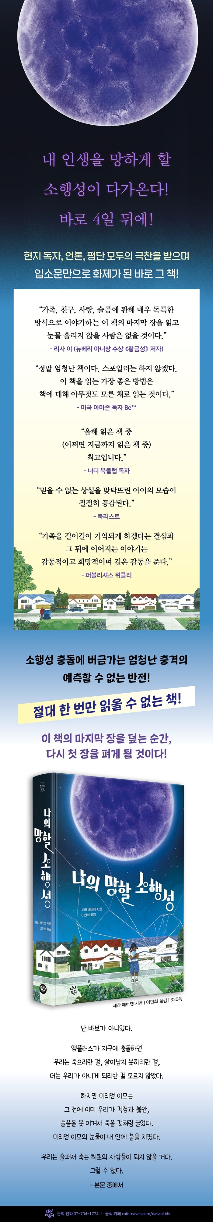 ¡¶ÇÁ·±Æ® µ¥½ºÅ©¡·, ¡¶¼º³ÉÆÈÀÌ ¼Ò³àÀÇ ¹Ý°Ý¡·, ¡¶½ºÆÄÅ©¡·, ¡¶¶óµð¿À Æ÷Æ÷ÇÁ¡· µî ÇöÁö¿¡¼ º£½ºÆ®¼¿·¯ ¹Ý¿¿¡ ¿À¸¥ ¼¼°è ¾ç¼µéÀ» ¹ø¿ªÇÏ¿© Ãâ°£Çϰí, ±¹³» âÀÛ µ¿È ¡¶ÃÖ¾ÇÀÇ ÃÖ¾Ö¡··Î ¸¹Àº µ¶ÀÚÀÇ »ç¶ûÀ» ¹Þ°í ÀÖ´Â ¡®´Ù»ê¾î¸°À̹®ÇС¯ ½Ã¸®ÁîÀÇ ½Å°£ ¡¶³ªÀÇ ¸ÁÇÒ ¼ÒÇ༺¡·ÀÇ ÁÖÀΰø Äɹ̰¡ ¹Ù·Î À§ÀÇ »óȲÀ» ¸Â´Ú¶ß¸°´Ù. °¡Á·°ú ÇÔ²² Æò¿ÂÇÑ ÀÏ»óÀ» º¸³»´ø ¾î´À ³¯, Áö±¸¸¦ ÇâÇØ µ¹ÁøÇÏ´Â ¼ÒÇ༺ÀÌ ¹ß°ßµÈ´Ù. ¾ÚÇ÷¯½º-68À̶ó ºÒ¸®´Â ±× ¼ÒÇ༺ÀÌ Áö±¸¿Í Ãæµ¹ÇÒ È®·üÀº 84.7%. Ãæµ¹±îÁö ³²Àº ½Ã°£Àº °íÀÛ 4ÀÏÀÌ´Ù. ¼ÒÇ༺ÀÌ Áö±¸¿Í Ãæµ¹Çϸé Áö±¸ÀÇ ¸ðµç °ÍÀÌ, ÄɹÌÀÇ ³²Àº Àλý¸¶Àúµµ ¼ÛµÎ¸®Â° »ç¶óÁø´Ù. ÀÌ Ãæ°ÝÀûÀÎ »ç½ÇÀ» ¾Ë°Ô µÈ ¼ø°£ºÎÅÍ ³²Àº 4ÀÏ µ¿¾È Äɹ̴ ¾î¶² ÀϵéÀ» ÆîÃÄ ³ª°¥±î?