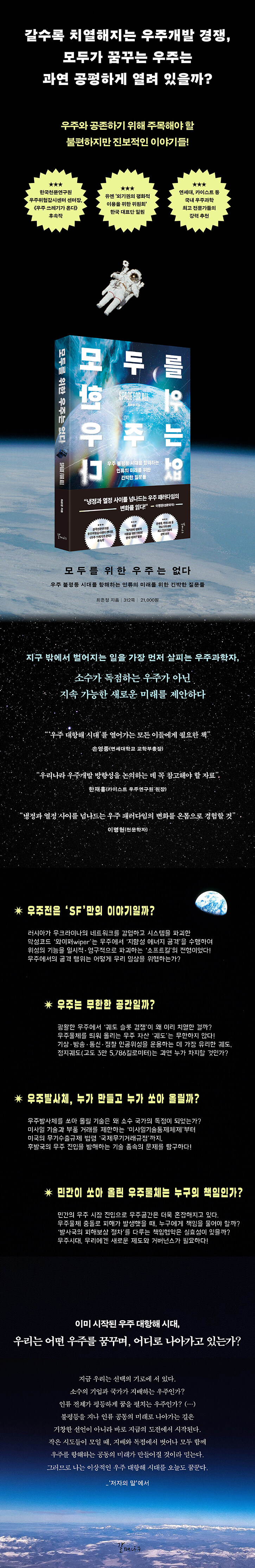 ¿ìÁÖ¿¡¼ ¹ú¾îÁö´Â ÀϵéÀ» ÁöÄѺ¸¸é¼, ¿ìÁÖÀÇ ÆòÈÀû ÀÌ¿ë°ú Àå±â Áö¼Ó °¡´É¼ºÀ» ÁøÁöÇÏ°Ô °í·ÁÇØº¸°Ô µÇ¾ú´Ù. ´Ü¹ß¼º Ž»ç¸¦ ³Ñ¾î °ÅÁÖ °ø°£À¸·Î¼ ¿ìÁÖ¸¦ Ž»öÇϰí ÀÖ´Â Áö±Ý, ¿ìÁÖ°³¹ßÀÇ ºÒÆòµîÇÑ ¸éÀ» Á÷½ÃÇϸ鼵µ ¡®¸ðµÎ¸¦ À§ÇÑ ¿ìÁÖ¡¯ÀÇ °¡´É¼ºÀ» ¸ð»öÇϰíÀÚ ¡º¸ðµÎ¸¦ À§ÇÑ ¿ìÁÖ´Â ¾ø´Ù¡»¸¦ ½è´Ù. Áö±¸À§ ¿ìÁÖÀÇ Æòȸ¦ Áö۸ç Áö¼Ó °¡´ÉÇÑ ¿ìÁÖȰµ¿À» ÇØ³ª°¡´Â µ¥ ´õ ¸¹Àº À̰¡ ÇÔ²²ÇÏ±æ ¹Ù¶ó´Â ¸¶À½À¸·Î Àú¼ú°ú °¿¬, ¹æ¼Û µî ´Ù¹æ¸é¿¡¼ Èû¾²°í ÀÖ´Ù.