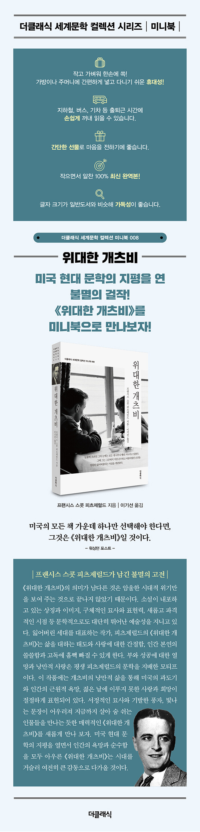 ºÎ¿Í ¼º°ø¿¡ ´ëÇÑ ¿¸Á°ú ³¶¸¸Àû »ç¶ûÀº Æò»ý ÇÇÃ÷Á¦·²µåÀÇ ¹®ÇÐÀ» Áö¹èÇÑ ¸ðƼÇÁÀÌ´Ù. ÀÌ ÀÛǰ¿¡´Â °³Ã÷ºñÀÇ ³¶¸¸Àû »îÀ» ÅëÇØ ¹Ì±¹ÀÇ °úµµ±â¿Í Àΰ£ÀÇ ±Ù¿øÀû ¿å¸Á, ÀþÀº ³¯¿¡ ÀÌ·çÁö ¸øÇÑ »ç¶û°ú Èñ¸ÁÀÌ ÀýÀýÇÏ°Ô Ç¥ÇöµÇ¾î ÀÖ´Ù. ¼Á¤ÀûÀÎ ¹¦»ç¿Í ±â¹ßÇÑ Ç³ÀÚ, ºû³ª´Â ¹®ÀåÀÌ ¾î¿ì·¯Á® Áö±Ý±îÁö »ì¾Æ ¼û ½¬´Â Àι°µéÀ» ¸¸³ª´Â µíÇÑ ¸Å·ÂÀûÀÎ ¡¶À§´ëÇÑ °³Ã÷ºñ¡·¸¦ »õ·Ó°Ô ¸¸³ª º¸ÀÚ. ¹Ì±¹ Çö´ë ¹®ÇÐÀÇ ÁöÆòÀ» ¿¸é¼ Àΰ£ÀÇ ¿å¸Á°ú ¼ø¼öÇÔÀ» ¸ðµÎ ¾Æ¿ì¸¥ ¡¶À§´ëÇÑ °³Ã÷ºñ¡·´Â ½Ã´ë¸¦ °Å½½·¯ ¿©ÀüÈ÷ Å« °¨µ¿À¸·Î ´Ù°¡¿Ã °ÍÀÌ´Ù.