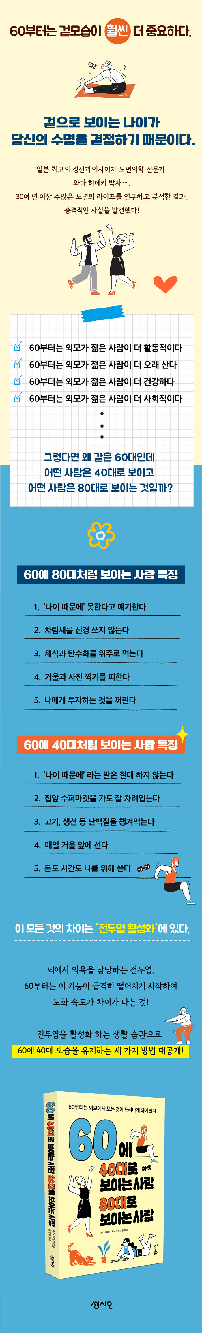 ±×·¸´Ù¸é ³ëÈ ¼Óµµ¸¦ ´ÊÃç 60¿¡ 40´ëó·³ »ì±â À§Çؼ´Â ¾î¶»°Ô ÇØ¾ß ÇÒ±î? °¡Àå Áß¿äÇÑ °Ç ÀÇ¿åÀÌ ¶³¾îÁö´Â °É ¸·´Â °ÍÀÌ´Ù. Àþ°í °Ç°ÇÏ°Ô º¸ÀÌ°í ½Í´Ù´Â ÀÇ¿åÀÌ ¶³¾îÁö¸é¼ ³ªÀÌ µé±â ½ÃÀÛÇϱ⠶§¹®ÀÌ´Ù. »ç½Ç ³ú°úÇÐÀûÀ¸·Î ÀÇ¿å °¨¼Ò´Â ³ëÈÀÇ ÀÚ¿¬½º·¯¿î Çö»óÀÌ´Ù. 60ºÎÅÍ ÀÇ¿åÀ» °üÀåÇÏ´Â ÀüµÎ¿± ±â´ÉÀÌ ±Þ°ÝÈ÷ ¶³¾îÁö±â ¶§¹®ÀÌ´Ù. ±×·¡¼ ¿ì¸®´Â °¡Àå ¸ÕÀú ÀüµÎ¿±À» Ȱ¼ºÈ½ÃŰ´Â ½À°üµéÀ» ÀÏ»ó¿¡ Á¤Âø½ÃÄÑ¾ß ÇÑ´Ù. ±×¸®°í ÁÖ¸§ ¾ø¾Ö°í Ȱ·Â ³ôÀÌ´Â ½Ä½À°ü, 60ºÎÅÍ Àþ°Ô ¸¸µå´Â ¿îµ¿¹ýÀ¸·Î °¡º±°Ô ½ÃÀÛÇÏ¸é µÈ´Ù. ¶ÇÇÑ Áß¿äÇÑ °ÍÀº ¿ÊÂ÷¸²°ú ¿Ü¸ð °ü¸®´Ù. °°Àº µ·À» µé¿©µµ ¾îµð¿¡ Æ÷ÀÎÆ®¸¦ ÁÖ´À³Ä¿¡ µû¶ó Àþ¾î º¸ÀÌ´Â »ç¶÷°ú ´Ä¾î º¸ÀÌ´Â »ç¶÷ÀÇ °ÝÂ÷°¡ »ý±ä´Ù. ÀúÀÚÀÇ Á¶¾ðÀ» ÇϳªÇϳª üũÇϸé, µ¶ÀÚ´Â Àڱ⠿ܸð °ü¸®¿Í »îÀ» ´ëÇϴ ŵµ¿¡ ¾î¶² ÇãÁ¡ÀÌ ÀÖ¾ú´ÂÁö Àß ÆÄ¾ÇÇÒ ¼ö ÀÖ°Ô µÈ´Ù. ¿äÄÁ´ë ¡®60ºÎÅÍÀÇ ¸Ú ºÎ¸®±â Æ÷ÀÎÆ®¡¯°¡ µû·Î ÀÖ´Ù´Â °Í! ³¡À¸·Î 60ºÎÅÍ Àþ¾î º¸À̸鼵µ ǰ°Ý Àִ ŵµ¸¦ °®Ãß±â À§ÇÑ ºñ°áµµ ¼Ò°³ÇÑ´Ù. ²Á´ëó·³ º¸ÀÌÁö ¾ÊÀ¸¸é¼ »ç¶÷µéÀÇ À̸ñÀ» ²ô´Â ¸»¼Ø¾¾¿Í ȼúÀÇ ¿øÃµÀÌ µÇ´Â Èï¹Ì·Î¿î ÁÖÁ¦ ã´Â ¹ý µî ½Ç¿ëÀûÀÎ ÁöÇý°¡ ³ÑÃij´Ù.