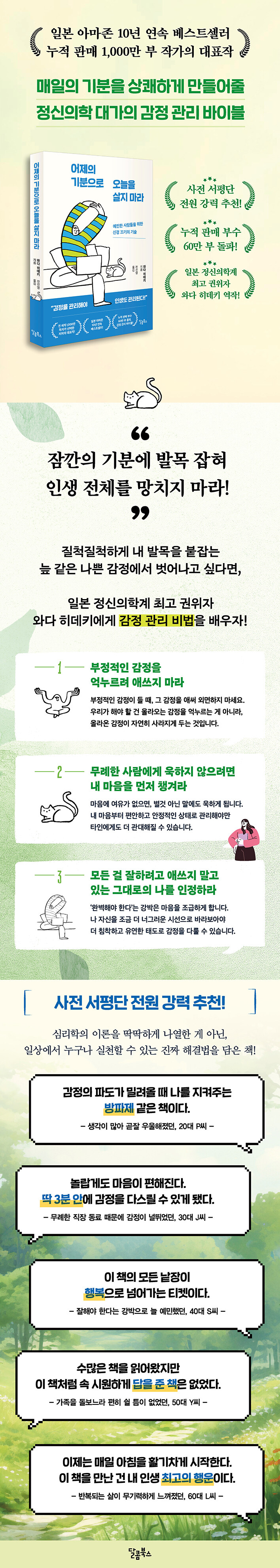 ÀÌ Ã¥Àº ½Ã°£ÀÌ ºÎÁ·ÇÑ Çö´ëÀÎÀ» À§ÇØ, ºÒÄèÇÑ °¨Á¤À» ½±°í ºü¸£°Ô Åо ¼ö ÀÖ´Â ½Ç¿ëÀûÀÎ ¹æ¹ýµéÀ» Á¦½ÃÇÑ´Ù. ³ª Ȧ·Î ´À³¢´Â ¿ì¿ïÇÑ °¨Á¤Àº ¹°·Ð, Àΰ£°ü°è ¼Ó¿¡¼ ¿À°¡´Â ¹Ì¹¦ÇÑ °¥µîÀÇ °¨Á¤±îÁö Æø³Ð°Ô ´Ù·ç°í ÀÖ¾î, ÀÏ»óÀ» »ì¾Æ°¡´Â µ¥ ÇÊ¿äÇÑ °ÅÀÇ ¸ðµç Á¶¾ðÀÌ ´ã°Ü ÀÖ´Ù°í ÇØµµ °ú¾ðÀÌ ¾Æ´Ï´Ù. ¶ÇÇÑ, ´©±¸³ª ½±°Ô ÀÐÀ» ¼ö ÀÖµµ·Ï Ä£ÀýÇÏ°Ô ¾²¿´±â ¶§¹®¿¡ Àá±ñ ÈȾ´Â °Í¸¸À¸·Îµµ Á¤½ÅÀÇÇÐ ´ë°¡°¡ ÀüÇÏ´Â °¨Á¤ °ü¸® ºñ¹ýÀ» °ðÀå ³» »î¿¡ Àû¿ëÇÒ ¼ö ÀÖ´Ù. ÇÏ·ç Á¾ÀÏ ÁúôÇÏ°Ô µû¶óºÙ´Â ³ª»Û °¨Á¤¿¡¼ ¹þ¾î³ª Æí¾ÈÇÑ ÀÏ»óÀ» µÇã°í ½Í´Ù¸é, Áö±Ý ¹Ù·Î ¡¶¾îÁ¦ÀÇ ±âºÐÀ¸·Î ¿À´ÃÀ» »ìÁö ¸¶¶ó¡·¸¦ ÆîÃĺ¸ÀÚ.