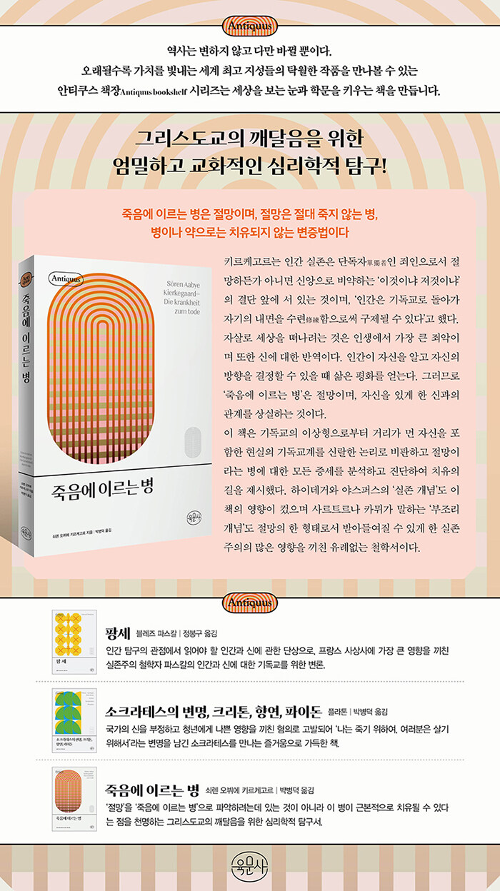 ۸£ÄÉ°í¸£¿¡°Ô ÀÖ¾î Àΰ£Àº ¡®Á¤½Å¡¯ÀÌ¸ç ±× ¡®Á¤½Å¡¯Àº °ð ¡®Àڱ⡯¿´´Ù. Àΰ£Àº ¹«¾ð°¡¿¡ ´ëÇØ Àý¸ÁÇÔÀ¸·Î½á ÀÚ±â Àڽſ¡ ´ëÇØ¼µµ Àý¸ÁÇϸç ÀÚ±â ÀÚ½ÅÀ¸·ÎºÎÅÍ Å»ÃâÇÏ·Á ÇÑ´Ù. Àý¸ÁÀ̶õ ÀÚ±âÀÇ ¡®¿µ¿øÇÑ °Í¡¯À» »ó½ÇÇÑ »óÅÂÀ̸ç Àý¸ÁÀÇ °µµ´Â Àΰ£ ½ÇÁ¸¿¡ ´ëÇÑ ÀνÄÀÇ °µµ¿¡ µû¶ó »ó½ÂÇÑ´Ù. Àΰ£¿¡°Ô ÀÖ¾î¼ ÀÌ·¯ÇÑ Àý¸ÁÀÌ °ð ¡®Á×À½¿¡ À̸£´Â º´¡¯À̸ç Àΰ£Àº Àý¸ÁÀ» ÅëÇØ¼¸¸ Áø½Ç·Î ±¸Á¦µÉ ¼ö ÀÖ´Ù. »ç¶÷µéÀº Àý¸ÁÀ» ¡®º´¡¯À¸·Î ¹Þ¾ÆµéÀÌ°í ¡®¾à¡¯À¸·Î´Â ÀÌÇØÇÏÁö ¾Ê´Â´Ù. ÇÑ ¸¶µð µ¡ºÙÀ̸é Á×À½¿¡ À̸£´Â º´À̶õ ÀÚÄ© Á×À» º´, Áï ±×°ÍÀ¸·Î Á×¾î ¹ö¸®´Â º´Ã³·³ ±×·± ÀǹÌÀÇ º´ÀÌ ¾Æ´Ï¶ó ±×°ÍÀ¸·Î´Â Àý´ë Á×Áö ¾Ê´Â º´À̸ç Á×À¸·Á¾ß Á×À» ¼ö ¾ø´Â º´ÀÌ´Ù. ¿ª¼³ÀûÀ¸·Î ¡®Àý¸Á¡¯À̶õ ¹Ù·Î ±×·± °ÍÀÌ´Ù. Á×¾î¼ ¶Ç´Â ÀÚ»ìÇØ¼ ¹¦Áö¿¡ ¾ÈÁÖÇÒ ¼ö ÀÖ´Ù¸é ±×°ÍÀº ¾ÆÁ÷ Àý¸ÁÀÇ ±ØÄ¡¶ó°í ÇÒ ¼ö ¾ø´Ù. Á×À¸·Á¾ß Á×À» ¼ö ¾ø´Â °Í, ²÷ÀÓ¾øÀÌ Á×À½¿¡ Á÷¸éÇϰí Á×À½¿¡ À̸£¸é¼µµ Á×À» ¼ö ¾ø´Â °Í, ±×·¯°í ¿µ¿øÈ÷ Á×Áö ¾ÊÀ¸¸é ¾È µÇ´Â °Í, À̰ÍÀÌ Àý¸ÁÇÏ´Â »ç¶÷ ¶Ç´Â °¡Àå ºÒÇàÇÑ »ç¶÷ÀÇ Âü¸ð½ÀÀÌ´Ù. ۸£ÄÉ°í¸£´Â Àΰ£ ½ÇÁ¸Àº ´Üµ¶ÀÚ(Ó¤Ô¼íº)ÀÎ ÁËÀÎÀ¸·Î¼ Àý¸ÁÇϵ簡 ¾Æ´Ï¸é ½Å¾ÓÀ¸·Î ºñ¾àÇÏ´Â ¡®À̰ÍÀÌ³Ä Àú°ÍÀ̳ġ¯ÀÇ °á´Ü ¾Õ¿¡ ¼ ÀÖ´Â °ÍÀ̸ç, ¡®Àΰ£Àº ±âµ¶±³·Î µ¹¾Æ°¡ ÀÚ±âÀÇ ³»¸éÀ» ¼ö·Ã(áóÖ£)ÇÔÀ¸·Î½á ±¸Á¦µÉ ¼ö ÀÖ´Ù¡¯°í Çß´Ù. ÀÌ Ã¥Àº ±âµ¶±³ÀÇ ÀÌ»óÇüÀ¸·ÎºÎÅÍ °Å¸®°¡ ¸Õ ÀÚ½ÅÀ» Æ÷ÇÔÇÑ Çö½ÇÀÇ ±âµ¶±³°è¸¦ ½Å¶öÇÑ ³í¸®·Î ºñÆÇÇϰí Àý¸ÁÀ̶ó´Â º´¿¡ ´ëÇÑ ¸ðµç Áõ¼¼¸¦ ºÐ¼®Çϰí Áø´ÜÇÏ¿© Ä¡À¯ÀÇ ±æÀ» Á¦½ÃÇß´Ù. ÇÏÀ̵¥°Å¿Í ¾ß½ºÆÛ½ºÀÇ ¡®½ÇÁ¸ °³³ä¡¯µµ ÀÌ Ã¥ÀÇ ¿µÇâÀÌ ÄÇÀ¸¸ç »ç¸£Æ®¸£³ª Ä«¹¿°¡ ¸»ÇÏ´Â ¡®ºÎÁ¶¸® °³³ä¡¯µµ Àý¸ÁÀÇ ÇÑ ÇüÅ·μ ¹Þ¾Æµé¿©Áú ¼ö ÀÖ°Ô ÇÑ ½ÇÁ¸ÁÖÀÇÀÇ ¸¹Àº ¿µÇâÀ» ³¢Ä£ À¯·Ê¾ø´Â öÇмÀÌ´Ù.