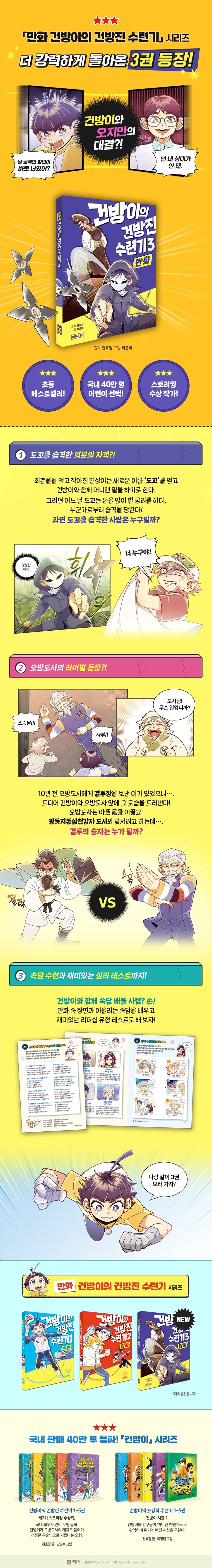 ºñ·æ¼ÒÀÇ ¸¸È ºê·£µå ¡®¾Ö´Ï¿Â¡¯ÀÌ ¡¸¸¸È °Ç¹æÀÌÀÇ °Ç¹æÁø ¼ö·Ã±â3¡¹À» Ãâ°£Çß´Ù. ÀÌ ½Ã¸®Áî´Â Á¦2ȸ ½ºÅ丮ŷ ¼ö»óÀÛÀÎ ¡¸°Ç¹æÀÌÀÇ °Ç¹æÁø ¼ö·Ã±â¡¹¸¦ ¿øÀÛÀ¸·Î ÇÑ ¸¸È·Î, ´©Àû 40¸¸ µ¶ÀÚ¸¦ »ç·ÎÀâÀº Àα⠼Ҽ³¿¡ ¸¸ÈÀû Àç¹Ì¸¦ ´õÇÑ ÀÛǰÀÌ´Ù. À̿ܿ¡µµ Àι® °íÀü ÇнÀ ¸¸È ¡¸ÀÐÀ¸¸é Ãʴɷ¡¹ ½Ã¸®Áî µîÀ» ÅëÇØ ¾Ö´Ï¿ÂÀº Àç¹ÌÀÖ°í ¾î¸°ÀÌ¿¡°Ô µµ¿òÀÌ µÇ´Â ¸¸È¸¦ ¸¸µé°í ÀÖ´Ù. ¡¸¸¸È °Ç¹æÀÌÀÇ °Ç¹æÁø ¼ö·Ã±â¡¹´Â Ã¥ Àб⸦ ¾î·Á¿öÇÏ´Â ¾ÆÀ̵鵵 ÀÚ¿¬½º·´°Ô ¸ôÀÔÇÒ ¼ö ÀÖµµ·Ï, ¾Ö´Ï¸ÞÀ̼ÇÀ» º¸´Â µíÇÑ È·ÁÇÑ ¾×¼Ç Àå¸é°ú ´Ù¾çÇÑ Ä³¸¯ÅÍ Ç¥Á¤À¸·Î ±¸¼ºµÇ¾ú´Ù. ȰÀÚ¿¡ Àͼ÷ÇÏÁö ¾ÊÀº ¾î¸°À̵µ Èï¹Ì·Ó°Ô µ¶¼ °æÇèÀ» ½×À» ¼ö ÀÖÀ» °ÍÀÌ´Ù.