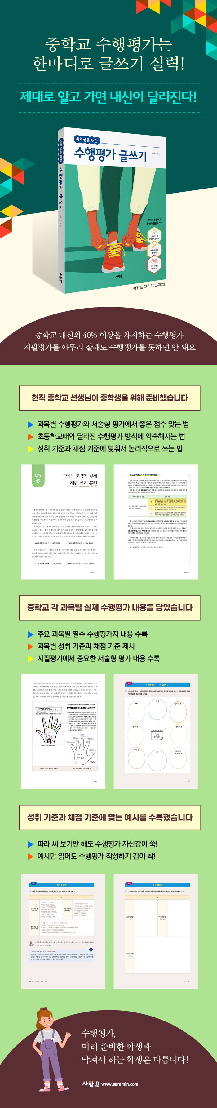 ÁßÇб³ ±¹¾î ±³»ç·Î ¼ö¸¹Àº ¾ÆÀ̵éÀÇ ¼öÇàÆò°¡¸¦ ÁöµµÇÑ ÀúÀÚ´Â ÁßÇлý ¾ÆÀ̵éÀÌ ¼öÇàÆò°¡¿Í °ü·ÃÇØ ²À ¾Ë°í ÀÖÀ¸¸é ÁÁ°Ú´Ù ½ÍÀº ³»¿ëµéÀ» º»¼¿¡ ¼¼úÇß½À´Ï´Ù. ³»½Å¿¡¼ ¼öÇàÆò°¡ÀÇ ÀǹÌ, äÁ¡ ±âÁذú ¼ºÃë ±âÁØ¿¡ ¸ÂÃç ¼öÇàÆò°¡ ±Û¾²±â ¾²´Â ¹ý, ¼¼úÇü Æò°¡ Áغñ¹ý µî ´©±¸³ª ÇØ¾ß ÇÏÁö¸¸ ¾Æ¹«µµ ÀÚ¼¼È÷ ¾Ë·Á ÁÖÁö ¾Ê¾Ò´ø ³»¿ëÀ» ´ã¾Æ, ÇлýµéÀÌ ÃʵîÇб³ ¶§¿Í ´Þ¶óÁø ¼öÇàÆò°¡¿¡ ´çȲÇÏÁö ¾Êµµ·Ï ÇÕ´Ï´Ù.