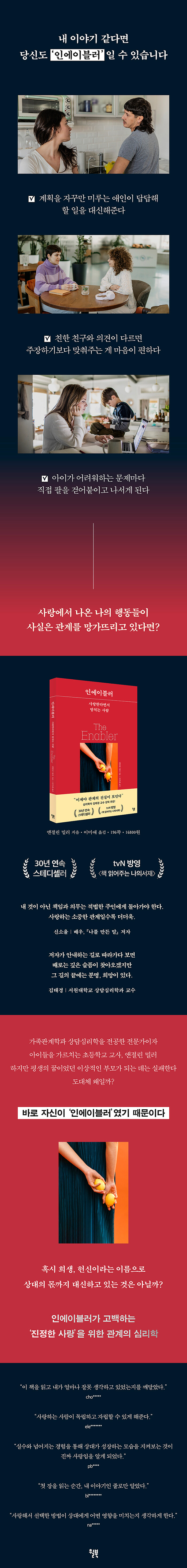 ¡°»ç¶ûÇÑ´Ù¸é¼ ¸ÁÄ¡´Â »ç¶÷, Àο¡ÀÌºí·¯´Â ¹Ù·Î ³ª¿´´Ù.¡± ±³À°°ú ½É¸® Àü¹®°¡ÀÌÀÚ ÇÑ °¡Á¤ÀÇ ¾ö¸¶ÀÎ ÀúÀÚ°¡ ÀÚ½ÅÀÇ À߸øµÈ °ü°è ¸Î±â ¹æ½ÄÀ» °í¹éÇÏ¸ç ¡®Àο¡ÀÌºí·¯¡¯¶ó´Â °³³äÀ» ¼Ò°³ÇØ Å« ¹ÝÇâÀ» ÀÏÀ¸Å² Ã¥. ¡º³ª´Â ³»°¡ ÁÁÀº ¾ö¸¶ÀÎ ÁÙ ¾Ë¾Ò½À´Ï´Ù¡»·Î óÀ½ Ãâ°£µÇ¾ú´ø ÀÌ Ã¥Àº ´ÜÁö ºÎ¸ð¿Í ÀÚ½Ä °ü°è¸¸À» À§ÇÑ À̾߱Ⱑ ¾Æ´Ï¶ó ¿¬ÀÎ, ºÎºÎ, Ä£±¸ µî ¼ö¸¹Àº ¹®Á¦Àû °ü°èÀÇ ÇÙ½ÉÀ» ¼³¸íÇØ³»´Â ÀÌÇØÀÇ Æ²À» Á¦½ÃÇϸç 30³â°£ Áٰ𠽺Å׵𼿷¯·Î ÀÚ¸®ÇؿԴÙ. Çѱ¹¾îÆÇ Ãâ°£ 5³âÀÌ Áö³ Áö±Ý, ¿øÁ¦ÀÌÀÚ ÀÌ Ã¥ÀÌ Á¦½ÃÇÏ´Â °¡Àå Áß¿äÇÑ °³³äÀÎ ¡®Àο¡ÀÌºí·¯¡¯¶ó´Â Á¦¸ñÀ¸·Î ´Ù½Ã Çѹø »õ·Ó°Ô Ãâ°£µÇ¾ú´Ù.