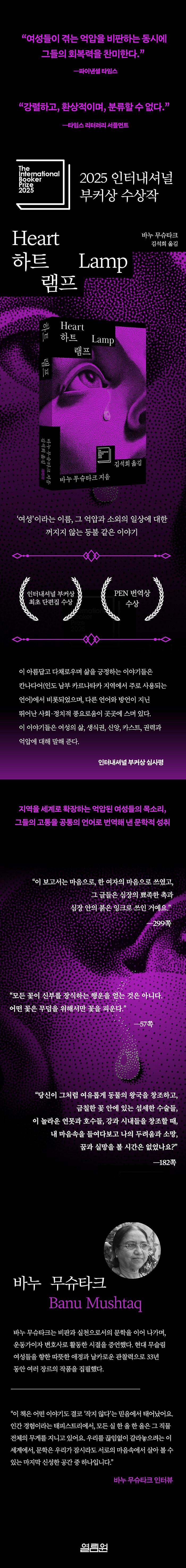 ¡ºÇÏÆ® ·¥ÇÁ¡»´Â ÀÎÅͳ»¼Å³Î ºÎÄ¿»ó ÃÖÃÊ ´ÜÆíÁý ¼ö»óÀÛÀÌ´Ù. ¹Ù´© ¹«½´Å¸Å©°¡ ±â·ÏÇÑ Àεµ ¿©¼ºµéÀÇ ÃÊ»óÀº °¡Á· ¹× Áö¿ª »çȸÀÇ °¥µîÀ» ¿¬¹Î ¾î¸° ¾ÖÁ¤°ú ³Ã¼ÒÀûÀÎ À¯¸Ó·Î Ç®¾î³½ µ¥¿¡ Âù»ç¸¦ ¹Þ¾Ò´Ù. ¡ºÇÏÆ® ·¥ÇÁ¡»ÀÇ ÁÖ¿ä ¹«´ë´Â ³²ÀεµÀÇ °¡ºÎÀåÀû À̽½¶÷ ¹®È±ÇÀÌ´Ù. ¿µÎ ÆíÀÇ À̾߱⿡¼ ÀÛ°¡´Â º¯¹æ¿¡¼ °íÅë¹Þ´Â ¿©¼ºµéÀÇ ÀÏ»óÀ» dzºÎÇÑ ±¸¾îü·Î Á¤±³ÇÏ°Ô Æ÷ÂøÇϸç, Àι°µéÀÇ µû¶æÇÑ ¸¶À½°ú ÀÛ°¡ÀÇ ¾îµÎ¿î À¯¸Ó °£ ´ëºñ¿¡¼ ¿ì·¯³ª´Â °¨Á¤Àû ±íÀ̸¦ ´À³¢°Ô ÇØ ÁØ´Ù. ƯÈ÷ ±×°¡ ¹¦»çÇÑ ÇÒ¸Ó´Ï-¾ö¸¶-µþÀÇ °ü°è´Â ¿©¼ºÀ¸·Î »ì¾Æ°¨¿¡ µû¶ó Áû¾îÁ®¾ß ÇÏ´Â »îÀÇ ¹«°Ô¿Í ±ä¹ÐÇØÁö´Â ¿¬´ë, ±»°ÇÇÑ ³»¸éÀÇ Èû, »ýÁ¸°ú ÀúÇ×À» ÅëÇØ Á¶¿ëÇÏÁö¸¸ °ÇÏ°Ô µ¶ÀÚ¸¦ ¸Å·á½ÃŲ´Ù. ¹«½´Å¸Å©´Â ÇÌÁøÇÑ ±¸¾îü¿¡¼ ±íÀº °¨Á¤À» ±æ¾î ³»´Â ³î¶ó¿î ÀÛ°¡ÀÌÀÚ Àι°ÀÇ ¸¶À½À» °üÂûÇÏ´Â ¿¬±¸ÀÚÀÌ´Ù. ±ØÀûÀÎ Ç÷Ժ¸´Ù ÀÏ»óÀû ³ª³¯À» µû¶ó°¡¸ç »çȸÀûÀÎ ¸Æ¶ô ¼Ó ¼¶¼¼ÇÑ °¨Á¤¼±À» Æ÷ÂøÇßÀ» »Ó ¾Æ´Ï¶ó, ÀçÄ¡ ÀÖ°í dzÀÚÀûÀΠƯÀ¯ÀÇ ¹®Ã¼´Â À̾߱â Àü¹Ý¿¡ ¾ÆÀÌ·¯´ÏÇÑ ±äÀå°¨À» ºÒ¾î³Ö´Â´Ù. ±×ÀÇ ÀÛǰÀº Àεµ¿¡¼ °¡Àå ±ÇÀ§ ÀÖ´Â ¹®Çлó°ú º¸¼öÀûÀÎ Áö¿ªµéÀÇ ºñ³À» µ¿½Ã¿¡ ¹Þ¾Ò´Ù. ¡ºÇÏÆ® ·¥ÇÁ¡»ÀÇ ºÎÄ¿»ó ¼ö»óÀº ÀεµÀÇ ÀúÇ×¹®ÇÐÀû ÀüÅëÀÌ ´ÜÁö Áö¿ª ´ã·Ð¿¡ ¸Ó¹«¸£Áö ¾Ê°í, ¹®ÈÀû ±¸Ã¼¼ºÀÌ ¼¼°è ¹®ÇÐÀÇ º¸ÆíÀû ¸Þ½ÃÁö·Î È®ÀåµÉ ¼ö ÀÖÀ½À» º¸¿© ÁÖ¸ç, Çö½Ã´ë »õ·Î¿î °íÀüÀÌ µÉ °ÍÀ» ¿¹°ßÇÑ´Ù.