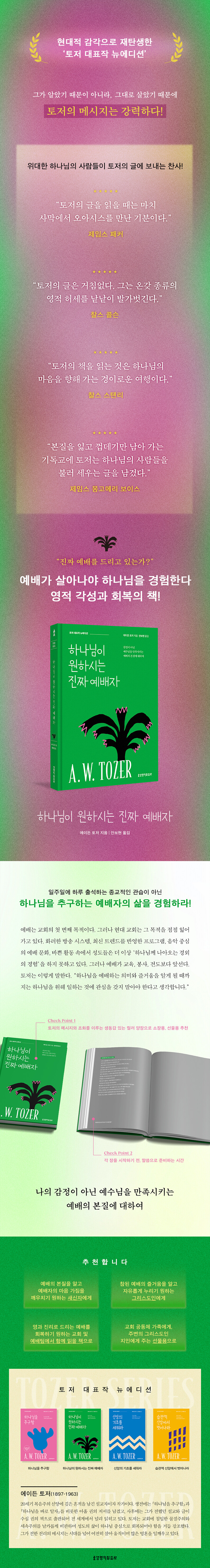 20¼¼±â º¹À½ÁÖÀÇ ½Å¾Ó¿¡ ±íÀº ÈçÀûÀ» ³²±ä ¼³±³ÀÚÀÌÀÚ ÀÛ°¡ÀÌ´Ù. ±×´Â ¹Ì±¹ Ææ½Çº£À̴Ͼƿ¡¼ ž û¼Ò³â±â¿¡ ȸ½ÉÇÑ ÈÄ, ²÷ÀÓ¾ø´Â ¼º°æ ¹¬»ó°ú ±âµµ·Î Çϳª´ÔÀ» Ãß±¸ÇÏ¸ç »ì¾Ò´Ù. 1919³âºÎÅÍ ±âµ¶±³¼±±³¿¬¸Í(Christian and Missionary Alliance)¿¡¼ 44³â°£ ¸ñȸÇÏ¸ç ¸»¾¸À¸·Î ¼ö¸¹Àº ¼ºµµ¸¦ ¼¼¿ì´Â µ¥ Çå½ÅÇß´Ù. »ýÀü¿¡´Â ¡ºÇϳª´ÔÀ» Ãß±¸ÇÔ¡»°ú ¡ºÇϳª´ÔÀ» ¹Ù·Î ¾ËÀÚ¡»¸¦ ºñ·ÔÇÑ ¾ÆÈ© ±ÇÀÇ Àú¼¸¦ ³²°å°í, »çÈÄ¿¡´Â ±×°¡ ÀüÇß´ø ¼³±³¿Í ±ÛÀÌ ¼ö½Ê ±ÇÀÇ Ã¥À¸·Î ÃâÆÇµÇ¾î Àü ¼¼°è¿¡¼ ³Î¸® ÀÐÈ÷°í ÀÖ´Ù. ÅäÀú´Â ±³È¸¿¡ ħÀÔÇÑ ¹°ÁúÁÖÀÇ¿Í ¼¼¼ÓÁÖÀǸ¦ ³¯Ä«·Ó°Ô ºñÆÇÇÏ¸ç ¼ºµµÀÇ »îÀÌ Çϳª´Ô Áß½ÉÀ¸·Î ȸº¹µÇ¾î¾ß ÇÔÀ» °Åµì °Á¶Çß´Ù. ±×´Â Æò»ý °æ°ÇÇÑ »îÀÇ ¸ð½ÀÀ¸·Î »ç¶÷µé¿¡°Ô º»º¸±â°¡ µÇ¾ú´Ù. ¡°Çϳª´ÔÀÇ »ç¶÷¡±À̶ó´Â ¹¦ºñ¸íÀÌ ±×ÀÇ »ý¾Ö¿Í »ç¿ªÀ» ¿ä¾àÇØ ÁØ´Ù. ±×°¡ ÀüÇÑ Áø¸®ÀÇ ¸Þ½ÃÁö´Â ½Ã´ë¸¦ ³Ñ¾î ¿©ÀüÈ÷ »ì¾Æ ¿òÁ÷ÀÌ¸ç ¸¹Àº ¿µÈ¥À» Àϱú¿ì°í ÀÖ´Ù.