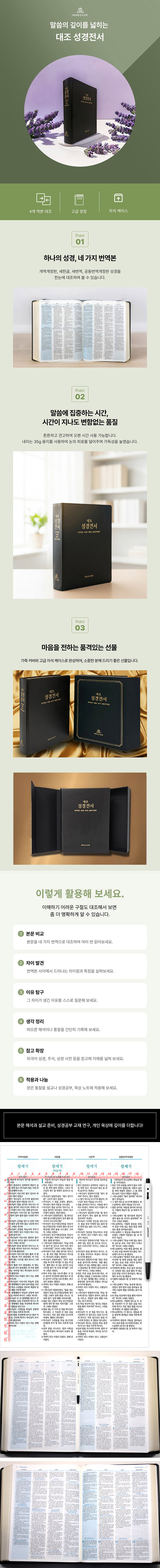 ¸»¾¸ÀÇ ±íÀ̸¦ ³ÐÈ÷´Â ´ëÁ¶ ¼º°æÀü¼. ³× °¡Áö ¹ø¿ªº»À» ÇÑ´«¿¡ ºñ±³ÇÏ¸ç ¼º°æ º»¹®ÀÇ Àǹ̸¦ ´õ¿í ±í°Ô, ´õ¿í ³Ð°Ô, ´õ¿í dz¼ºÇÏ°Ô º¼ ¼ö ÀÖ´Ù. º»¹® ÇØ¼®°ú ¼³±³ Áغñ, ¼º°æ°øºÎ ±³Àç ¿¬±¸, °³ÀÎ ¹¬»ó¿¡ ±íÀ̸¦ ´õÇÑ´Ù.