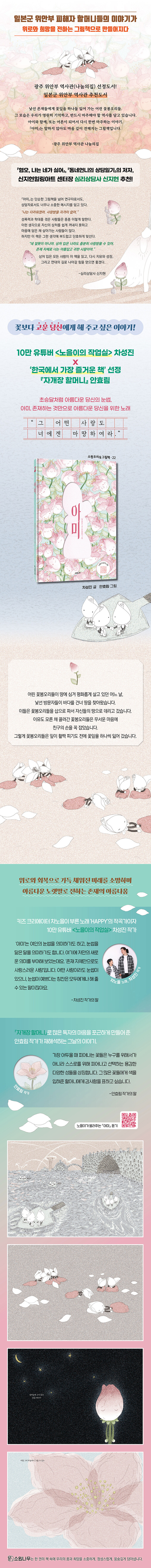 ¡º¾Æ¹Ì¡»´Â À§¾ÈºÎ ÇÇÇØÀÚ ÇåÁ¤°îÀ¸·Î ¸¸µé¾îÁø ¡¸¾Æ¹Ì¡¹¸¦ ±×¸²Ã¥À¸·Î ÀçÇØ¼®ÇÏ¿© ´Ù°¡¿À´Â ±¤º¹ 80ÁÖ³â, ¡®ÀϺ»±º À§¾ÈºÎ ÇÇÇØÀÚ ±â¸²ÀÇ ³¯¡¯À» ±â¾ïÇÏ´Â Àǹ̷Π¸¸µé¾îÁ³½À´Ï´Ù. 10¸¸ À¯Æ©ºê ä³ÎÀÎ <³ëÀ»ÀÌÀÇ ÀÛ¾÷½Ç>À» ¿î¿µÇÏ´Â Â÷¼ºÁø ÀÛ°î°¡¿Í 2025³â ¡®Çѱ¹¿¡¼ °¡Àå Áñ°Å¿î Ã¥¡¯¿¡ ¼±Á¤µÈ ¡ºÀÚ°³Àå ÇÒ¸Ó´Ï¡»¸¦ ¾²°í ±×¸° ¾ÈÈ¿¸² ÀÛ°¡ÀÇ ±×¸²ÀÌ ¸¸³ª À§·Î¿Í Èñ¸ÁÀ» ÀüÇÏ´Â ¾Æ¸§´Ù¿î ±×¸²Ã¥, ¡º¾Æ¹Ì¡»´Â ¾ÆÇİú ½½ÇÄÀ» °Þ¾úÀ½¿¡µµ ¿©ÀüÈ÷ Çǰí Áö´Â ²Éó·³, À§¾ÈºÎ ÇÇÇØÀÚµéÀÇ ¼þ°íÇÑ Èñ»ý°ú ¿ë±â´Â ¿µ¿øÈ÷ Áö¼ÓµÈ´Ù´Â À̾߱⸦ ´ã°í ÀÖ½À´Ï´Ù.