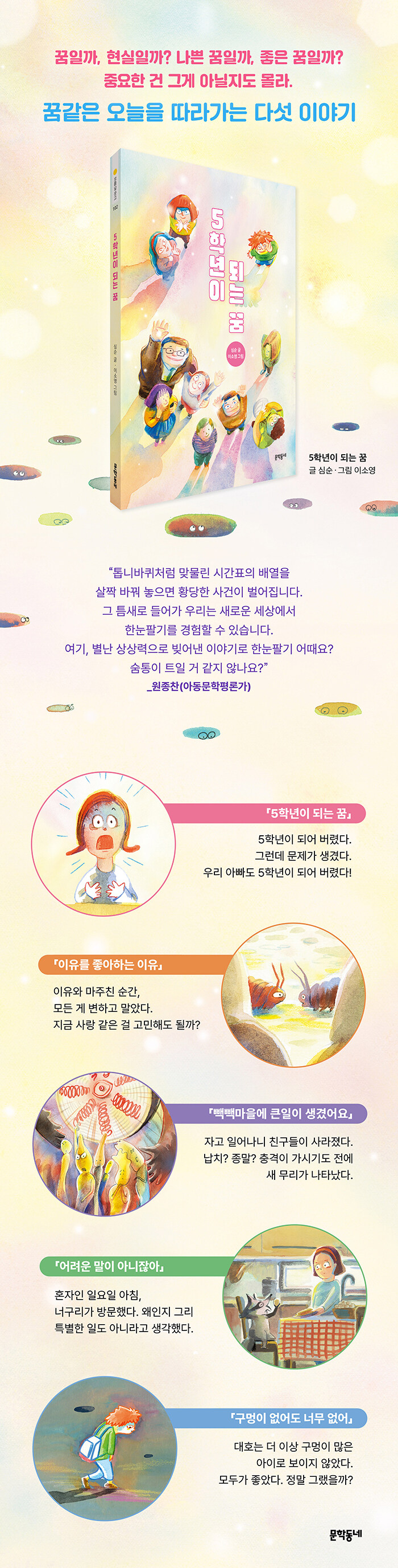 µ¶Æ¯ÇÑ ¼ÒÀç¿Í ´ë´ãÇÑ »ó»ó·ÂÀ¸·Î ¹ßÇ¥ÇÏ´Â ÀÛǰ¸¶´Ù ÁÖ¸ñ¹Þ°í ÀÖ´Â ½É¼ø ÀÛ°¡ÀÇ ´ÜÆíÁý ¡º5ÇгâÀÌ µÇ´Â ²Þ¡»ÀÌ Ãâ°£µÇ¾ú´Ù. ¡°¾î¸°À̵éÀÌ ±³°¨ÇÒ ¸¸ÇÑ µ¿ÈÀû »ó»ó·ÂÀ¸·Î »îÀÇ ºñ¹ÐÀ» ¿³º¸°Ô ÇÑ´Ù.¡± ¡°¾î¸°ÀÌ µ¶ÀÚ¸¦ ¿ì½À°Ô º¸Áö ¾Ê°í, ½±°Ô ¹«¾ùÀ» °¡¸£Ä¡·Á µéÁö ¾ÊÀ¸¸é¼µµ Àΰ£ º¸ÆíÀÇ Áø½Ç¿¡±îÁö ´ã´ãÇÏ°Ô ´Ù°¡°£´Ù.¡±¶ó´Â ÆòÀ» ¹ÞÀ¸¸ç Á¦25ȸ âºñ ÁÁÀº¾î¸°ÀÌÃ¥ ´ë»óÀ» ¼ö»óÇÑ ½É¼ø ÀÛ°¡´Â ƯÀ¯ÀÇ ±àÁ¤¼º°ú ÁøÁ¤¼ºÀ» ´ãÀº À̾߱â·Î ¾î¸°ÀÌ µ¶ÀÚ¸¦ Ȱ¹ßÈ÷ ¸¸³ª°í ÀÖ´Ù. ¡º5ÇгâÀÌ µÇ´Â ²Þ¡»¿¡´Â °íÇгâÀÌ µÇ¸é¼ Áö³ªÄ¡°Ô Ä£±¸µé ´«Ä¡¸¦ º¸°Å³ª, ȤÀº ³Ê¹« ´«Ä¡¸¦ º¸Áö ¾Ê¾Æ °ï¶õ¿¡ óÇÏ´Â ¾ÆÀ̰¡ µîÀåÇÏ´Â À̾߱⠵ΠÆí, ¡®½ÇÁ¸ÀÇ ¹®Á¦¡¯¿Í ¸Â´Ú¶ß¸° Áã¸ç´À¸®¿Í ¸Ó¸®Ä«¶ô, ±¸¸ÛÀÌ ¼»ç¸¦ ±ØÀûÀ¸·Î À̲ô´Â À̾߱⠼¼ ÆíÀÌ ´ã°Ü ÀÖ´Ù. ²ÞÀÎ µí Çö½ÇÀÎ µí ±ä°¡¹Î°¡ ¿À¶ô°¡¶ô ²Þ°á °°Àº ÆÇŸÁö¿Í, ³ª ÀڽŰú ÁÖº¯À» °ñ¶ÊÈ÷ µé¿©´Ùº¸°Ô ÇÏ´Â ±½Á÷ÇÑ Áú¹®ÀÌ Á¶È¸¦ ÀÌ·ç´Â ´ÜÆíÁýÀÌ´Ù.