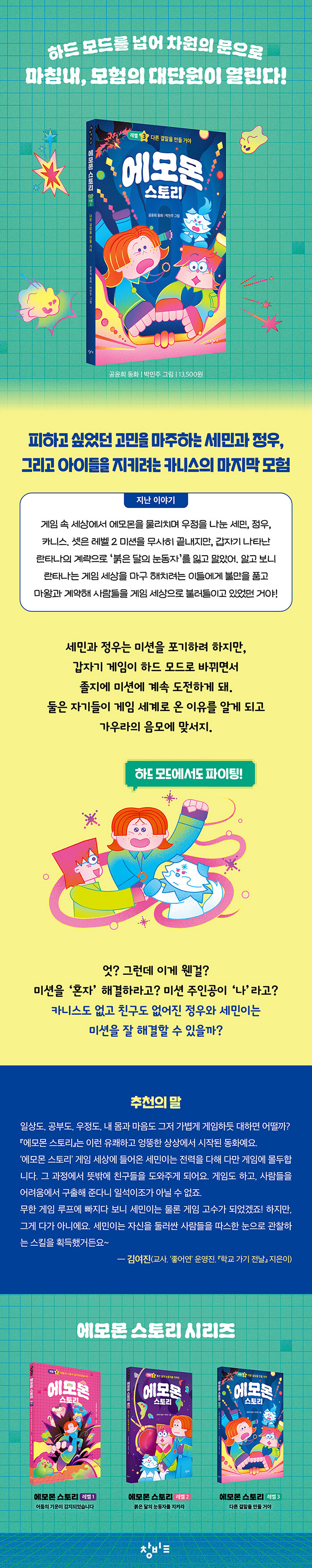 ¡®°ÔÀÓ ¼Ó¿¡ µé¾î°¡ º¸¸é ÁÁ°Ú´Ù!¡¯ ¡º¿¡¸ð¸ó ½ºÅ丮¡»´Â ¾î¸°À̵éÀÌ ÇÑ ¹øÂëÀº ÇØ º¼ ¹ýÇÑ »ó»óÀ» À̾߱â·Î ±¸ÇöÇØ ³½ ¸ðÇè ÆÇŸÁö µ¿È´Ù. ¡®¿¡¸ð¸ó ½ºÅ丮¡¯¶ó´Â °ÔÀÓ ¼Ó¿¡ µé¾î°¡°Ô µÈ ¼¼¹ÎÀ̰¡ ¼ºÀû, ¿Ü¸ð, °©Áú ¹®Á¦¸¦ Çö¸íÇÏ°Ô ÇØ°áÇØ ³½ 1±Ç¿¡ À̾î 2±Ç¿¡¼´Â ¼¼¹ÎÀ̰¡ Á¤¿ì, Ä«´Ï½º¿Í ¸¸³ª ¸Â¹úÀÌ ºÎ¸ð´ÔÀ» µÐ Ä£±¸ÀÇ ¿Ü·Î¿ò, ¼ºº°·Î ÆíÀ» °¥¶ó ´ÙÅõ´Â ¾ÆÀ̵éÀÇ °¥µîÀ» ÇØ¼ÒÇÏ´Â À̾߱Ⱑ ´ã°Ü ÀǹÌ, Àç¹Ì, Èï¹Ì¸¦ °í·ç ÃæÁ·ÇÑ µ¿È ½Ã¸®Áî·Î ÀÚ¸®¸Å±èÇß´Ù. ¡º¿¡¸ð¸ó ½ºÅ丮 3¡»¿¡¼, ÁýÀ¸·Î °¡´Â ¿¼èÀÎ ¡®ºÓÀº ´ÞÀÇ ´«µ¿ÀÚ¡¯¸¦ ¾òÀ¸·Á´Â ¼¼¹Î°ú Á¤¿ì´Â À̵éÀ» °ÔÀÓ ¼Ó¿¡ °¡µÎ·Á´Â ¸¶¿ÕÀÇ °è·«¿¡ ±â²¨ÀÌ µµÀüÇÑ´Ù. ÇÏÁö¸¸ À̵éÀ» ºñ¿ôµí ¸¶¿ÕÀº ¼¼¹Î°ú Á¤¿ì¸¦ °¢°¢ ±×µéÀÌ °¡Àå ¿Ü¸éÇÏ°í ½Í¾î ÇÏ´Â »óȲ¿¡ ºü¶ß¸°´Ù. ¸öÀÌ ¾ÆÆÄ Çб³¸¦ ½¬¾ú´ø Á¤¿ì¿¡°Ô´Â µî±³Çؼ ÇÑ »ì ¾î¸° Ä£±¸µé°ú ¾î¿ï·Á¾ß ÇÏ´Â °úÁ¦°¡, ºÎ¸ð´ÔÀÌ ÀÌÈ¥Çϱâ ÀüÀ¸·Î µ¹¾Æ°£ ¼¼¹Î¿¡°Ô´Â ¾î¸¥µéÀÇ °¨Á¤À» Á¸ÁßÇÏ°í »õ·Î¿î °¡Á·ÀÇ ÇüŸ¦ ÀÎÁ¤ÇØ¾ß ÇÏ´Â ¹Ì¼ÇÀÌ ÁÖ¾îÁø´Ù. Áý¿¡ µ¹¾Æ°¡Áö ¾ÊÀº ä °ÔÀÓ ¼Ó¿¡ ³²¾Æ ºÒ¾ÈÇÑ Æòȸ¦ ÁöŰ·Á´Â ¼¼¹Î°ú Á¤¿ì. ¸¶¿ÕÀÇ °è·«¿¡ ºüÁø µÎ Ä£±¸¸¦ ÁýÀ¸·Î µ¹·Áº¸³»·Á ¾Ö¾²´Â ¼öÈ£ ±â»ç Ä«´Ï½ºÀÇ À̾߱â´Â ¾î¸°ÀÌ µ¶Àڵ鿡°Ô ¹Ù¸£°í ³Ê¸¥ ¸¶À½À» °¡Áö·Á¸é ÀÚ½ÅÀÇ °í¹ÎºÎÅÍ Á÷½ÃÇÒ ÁÙ ¾Ë¾Æ¾ß ÇÑ´Ù´Â ±³ÈÆÀ» °Ç³Ù´Ù.