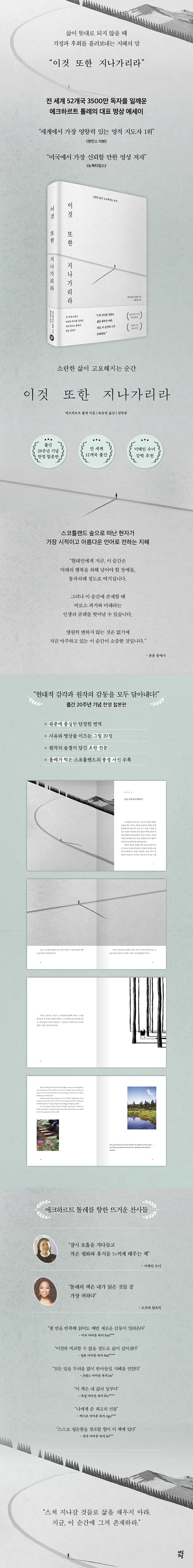 Ãâ°£ 20ÁÖ³âÀ» ±â³äÇØ »õ·Ó°Ô ¼±º¸ÀÌ´Â ¡ºÀÌ°Í ¶ÇÇÑ Áö³ª°¡¸®¶ó¡»´Â ÇÑ¿µ ÇÕº»ÆÇÀ¸·Î Ưº° ±âȹµÇ¾ú´Ù. ¿ø¹®¿¡ ´ëÇÑ ±íÀº ÀÌÇØ¸¦ ¹ÙÅÁÀ¸·Î Ãæ½ÇÇÏ°í ´ÜÁ¤ÇÏ°Ô ¹ø¿ªÇϰí, »çÀ¯¿Í ¸í»óÀ» À̲ô´Â ½ÃÀûÀÎ ±×¸² 20Á¡À» Ãß°¡ÇØ Çö´ëÀû °¨°¢À» ´õÇß´Ù. À̹ø °³Á¤ÆÇ¿¡ »õ·Ó°Ô ¼ö·ÏµÈ 20Á¡ÀÇ ÀÛǰÀº ÀÚ¹ßÀû ħ¹¬°ú °íµ¶À» ÁÖÁ¦·Î ÀÛ¾÷ÇÏ´Â ¼¼°èÀûÀÎ ÀÛ°¡ ¼ÕÁ¤±âÀÇ ÀÛǰÀÌ´Ù. ±×ÀÇ ÀÛǰ ¼Ó ±¤È°ÇÑ ½£À¸·Î ¶°³ ÀÛÀº Àι°À» ¸ð½ÀÀº ¿¡Å©Çϸ£Æ® Åç·¹°¡ ÀüÇÏ´Â ÁöÇý¿¡ ¿À·ÔÀÌ ¸Ó¹°µµ·Ï À̲ø¾î ÁØ´Ù. ¶ÇÇÑ Ã¥¿¡´Â ¿øÀÛÀÇ ¼û°áÀÌ ´ã±ä ÃÊÆÇ Àü¹®°ú Åç·¹°¡ Á÷Á¢ ÂïÀº dz°æ »çÁøÀÌ ´ã°Ü ÀÖ¾î ¿øÀÛÀÇ °¨µ¿À» °í½º¶õÈ÷ ÀüÇÑ´Ù. ¾î¶² ÆäÀÌÁö¸¦ ÆîÄ¡´õ¶óµµ ¸¶À½¿¡ »õ±â°í ½ÍÀº ¹®Àå°ú »ç»ö¿¡ À̸£´Â ±×¸²ÀÌ ±â´Ù¸°´Ù.