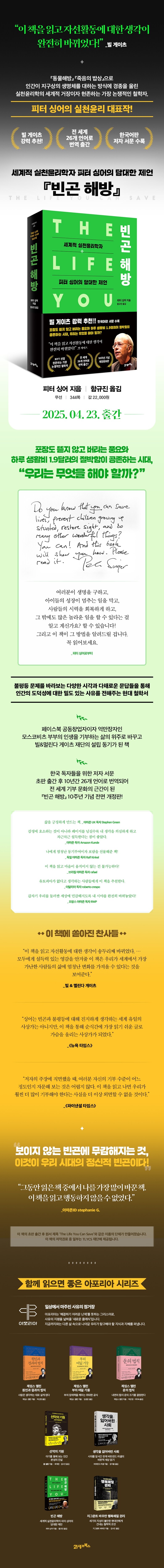 ½ÇõÀ±¸®ÇÐÀÇ ¼¼°èÀû °ÅÀå ÇÇÅÍ ½Ì¾îÀÇ ¿ªÀÛ ¡ººó°ï ÇØ¹æ(The Life You Can Save)¡»ÀÌ 10ÁÖ³âÀ» ¸Â¾Æ Àü¸é°³Á¤ÆÇÀ¸·Î »õ·Ó°Ô Ãâ°£µÆ´Ù. Àü Áö±¸Àû ºÒÆòµî ¹®Á¦¿¡ ´ëÇÑ Çõ¸íÀûÀÎ Á¢±Ù¹ýÀ» Á¦½ÃÇϸç, °³ÀÎÀÇ À±¸®Àû Ã¥ÀÓÀ» °Á¶ÇÑ ÀÌ Ã¥Àº, Ãâ°£ ÀÌÈÄ ºô °ÔÀÌÃ÷¿Í ¿ö·± ¹öÇÍÀÇ '´õ ±âºù Ç÷¹Áö' Ä·ÆäÀÎÀÇ °è±â°¡ µÇ¾ú°í, µ¶ÀÚµéÀÌ ÀÚ¹ßÀûÀ¸·Î Àç´ÜÀ» ¼³¸³ÇÏ´Â µî Å« º¯È¸¦ À̲ø¾î³Â´Ù. 26°³ ¾ð¾î·Î ¹ø¿ªµÇ¾î Àü ¼¼°è µ¶ÀÚµéÀÇ µµ´öÀû ±âÁØÀ» Á¦½ÃÇÑ ½ÇõÀ±¸® ºÐ¾ßÀÇ ´ëÇ¥ µµ¼·Î ÀÚ¸®¸Å±èÇß´Ù.