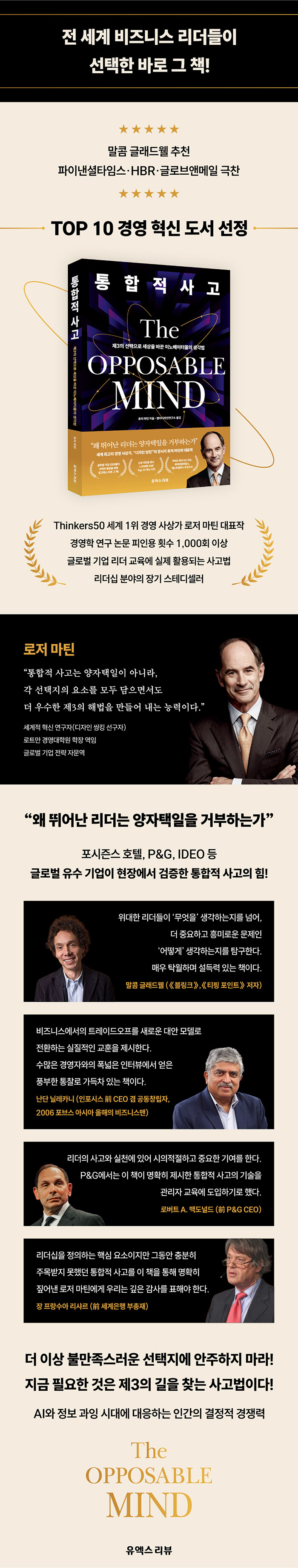 ¡¶ÅëÇÕÀû »ç°í¡·´Â ±âÁ¸ÀÇ ¾çÀÚÅÃÀÏÀû »ç°í¿¡¼ ¹þ¾î³ª, »óÃæÇÏ´Â µÎ °¡Áö ¼±ÅÃÁö »çÀÌ¿¡¼ ÀüÇô »õ·Î¿î ÇØ¹ýÀ» ¸¸µé¾î ³»´Â »ç°í Àü·«À» Á¦½ÃÇÑ´Ù. ·ÎÀú ¸¶Æ¾ÀÌ ¸»ÇÏ´Â ¡®ÅëÇÕÀû »ç°í¡¯¶õ µÑ Áß Çϳª¸¦ Æ÷±âÇϴ ŸÇùÀÌ ¾Æ´Ï¶ó, Ãæµ¹ÇÏ´Â µÎ ¸ðµ¨ »çÀÌÀÇ ±äÀåÀ» À¯ÁöÇÏ¸ç ´õ ³ªÀº Á¦3ÀÇ ÇØ´äÀ» ¼³°èÇÏ´Â ´É·ÂÀÌ´Ù. ±×´Â ¹Ù·Î ÀÌ ´É·ÂÀÌ À§±â ¼Ó¿¡¼ Çõ½ÅÀ» ¸¸µé¾î ³»´Â ¸®´õµéÀÇ °øÅëÁ¡À̶ó°í ¸»ÇÑ´Ù.