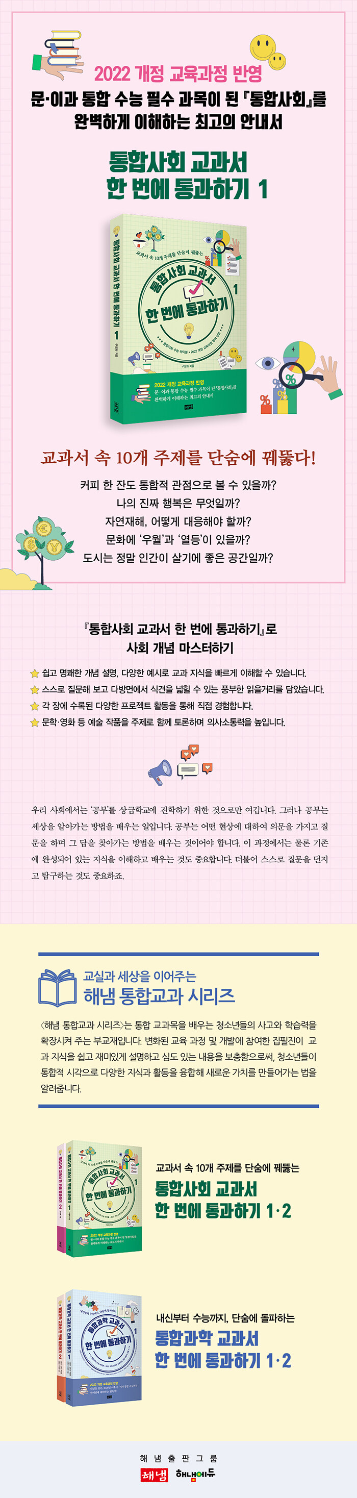 ÀÌ·± º¯È¿¡ ¹ß¸ÂÃß¾î ¡ºÃ»¼Ò³âÀ» À§ÇÑ »çȸÇÐ ¿¡¼¼ÀÌ¡» µîÀÇ º£½ºÆ®¼¿·¯ ÀúÀÚÀÎ ±¸Á¤È ±³¼ö°¡ 2022 °³Á¤ ±³À°°úÁ¤À» ¹Ý¿µÇÏ¿© ¡ºÅëÇÕ»çȸ ±³°ú¼¿Í ÇÔ²² Àбâ 1¡¤2¡»¸¦ °³Á¤Çß´Ù. ¡ºÅëÇÕ»çȸ ±³°ú¼ ÇÑ ¹ø¿¡ Åë°úÇϱâ 1¡¤2¡»¶ó´Â »õ·Î¿î À̸§À¸·Î ³ª¿Â ÀÌ ½Ã¸®Áî´Â <ÇØ³¿ ÅëÇÕ±³°ú ½Ã¸®Áî>ÀÇ Ã¹ ¹øÂ° Ã¥À¸·Î, ±³°ú¼ ¼Ó 10°³ ÁÖÁ¦¸¦ ¼ø¼´ë·Î Ãæ½ÇÈ÷ µû¶ó°¡µÇ ±³°ú¼¿¡¼´Â ´Ù·çÁö ¸øÇÑ Àç¹ÌÀÖ´Â »ç·Êµé°ú dzºÎÇÑ È°µ¿À» Á¦½ÃÇÏ¿© ºÎ±³Àç·Î¼ ÃÖÀûÀÇ È°¿ë¼ºÀ» °®Ãè´Ù.
