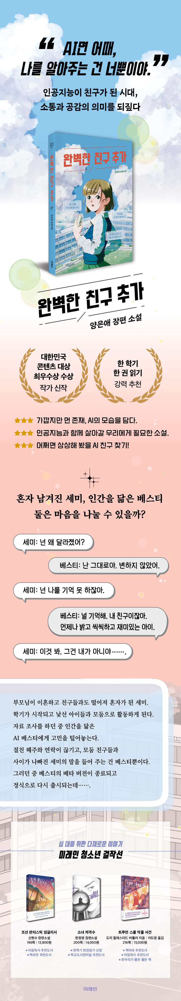 ´ëÇѹα¹ ÄÜÅÙÃ÷ ´ë»ó ÃÖ¿ì¼ö»óÀ¸·Î û¼Ò³â ¹®Çп¡ ¹ßÀ» µðµò ¾çÀº¾Ö ÀÛ°¡ÀÇ ½ÅÀÛ ¡º¿Ïº®ÇÑ Ä£±¸ Ãß°¡¡»°¡ Ãâ°£µÆ´Ù. ¼Ò¼³Àº È¥ÀÚ ³²°ÜÁø ¼¼¹Ì°¡ AI º£½ºÆ¼¸¦ ¸¸³ª ÁøÁ¤ÇÑ ¼ÒÅë°ú ÇÔ²²ÇÔÀÇ °¡Ä¡¸¦ ±ú´Ý´Â À̾߱â´Ù. ÀΰøÁö´É°ú Àΰ£ÀÇ °æ°è¿¡¼ ÁøÂ¥ ¡®³ª¡¯¸¦ ¹ß°ßÇϰí, °Ç°ÇÑ °ü°èÀÇ ±ÕÇüÀ» ã¾Æ°£´Ù. AI¿Í ÇÔ²² »ì¾Æ°¡´Â û¼Ò³âÀÇ ¸ð½ÀÀ» °¡±îÀÌ µé¿©´Ùº¸¸ç Áö±Ý ¿ì¸®°¡ °í¹ÎÇØ¾ß ÇÒ ÁöÁ¡À» ´ã¾Ò´Ù.