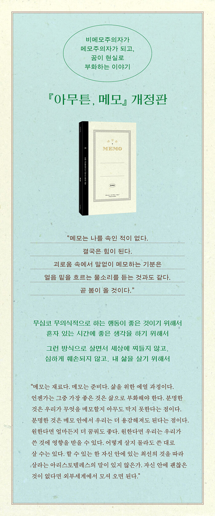 2020³â Ãâ°£µÇ¾î ¼ö¸¹Àº µ¶ÀÚµéÀÇ ¸¶À½À» ¿òÁ÷ÀÎ Á¤ÇýÀ± ÀÛ°¡ÀÇ ¡º¾Æ¹«Æ°, ¸Þ¸ð¡»°¡ »õ·Î¿î Ç¥Áö·Î ÀçÃâ°£µÇ¾ú´Ù. ¶óµð¿À ÇǵðÀÌÀÚ ¿Á¤ÀûÀÎ ¾Öµ¶°¡ Á¤ÇýÀ±, »ç½Ç ±×´Â ¸Þ¸ð¸¦ ÇÒ ¼ö ¾ø´Â Àΰ£À̾ú´Ù. ¡°À¢¸¸ÇÏ¸é ´Ù Àؾî¹ö¸®°í¡±, ¸Þ¸ð¸¦ ÇÏ·Á´Â ¼ø°£ ¸Å¹ø ¡°À̾߱⿡ Ȧ·Á¡± ±â·ÏÇÑ ¼ø°£À» ³õÃĹö·Á ÇÏ·ç Á¾ÀÏ ¡®ÀØÁö ¸»ÀÚ. ÀØÁö ¸»ÀÚ¡¯¸¦ µÇ³ú¸ç ¾î¿ ¼ö ¾øÀÌ ºñ¸Þ¸ðÁÖÀÇÀÚ·Î »ì´ø ±×´Â ¿Ö ¿·ÄÇÑ ¸Þ¸ðÁÖÀÇÀÚ°¡ µÇ¾úÀ»±î? ÀúÀÚ´Â ¸»ÇÑ´Ù. À§±âÀÇ ¼ø°£¿¡ ¸»µéÀº °£ÀýÇÏ°Ô µé¸®°í, ½½Çà ¶§´Â »ç¼ÒÇÑ ±â»Ýµµ °áÁ¤ÀûÀ̶ó°í. ¸Þ¸ð´Â ³ª¸¦ ¼ÓÀÎ ÀûÀÌ ¾ø°í °á±¹¿¡´Â ÈûÀÌ µÈ´Ù°í. ±«·Î¿ò ¼Ó¿¡¼ ¸»¾øÀÌ ¸Þ¸ðÇÏ´Â ±âºÐÀº ¾óÀ½ ¹ØÀ» È帣´Â ¹°¼Ò¸®¸¦ µè´Â °Í°úµµ °°°í, ±×·¸°Ô º½ÀÌ ¿Â´Ù°í. ¡º¾Æ¹«Æ°, ¸Þ¸ð¡»´Â ¸Þ¸ð°¡ »îÀ» À§ÇÑ Àç·áÀÌÀÚ ¿¹¿ °úÁ¤À̶ó°í ¹Ï´Â ÇÑ ¸Þ¸ðÁÖÀÇÀÚÀÇ ±â·ÏÀ¸·Î, ºñ¸Þ¸ðÁÖÀÇÀÚ°¡ ¸Þ¸ðÁÖÀÇÀÚ°¡ µÇ°í, ²ÞÀÌ Çö½Ç·Î ºÎÈÇϰí, ¾´ ´ë·Î »ì°Ô µÈ À̾߱â´Ù. ±×¸®°í ¹«¾ùº¸´Ù ¸Þ¸ðÀå ¾È¿¡¼ ´õ ¿ë°¨ÇØÁø À̾߱â´Ù.