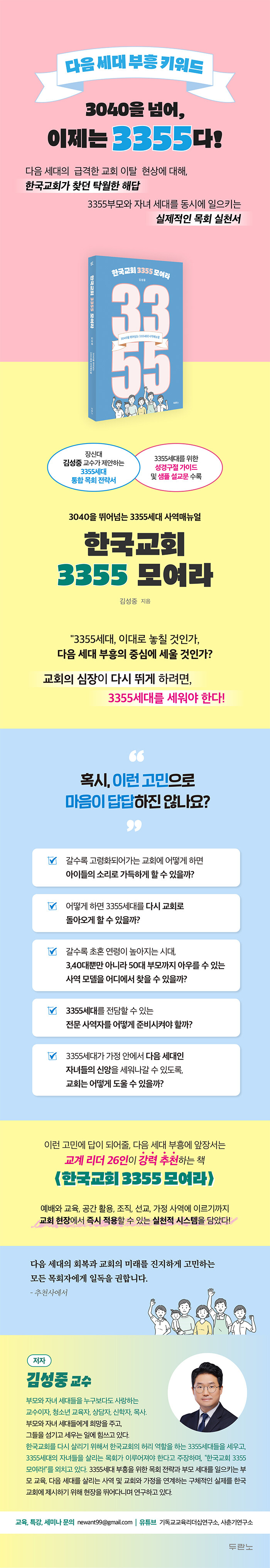 Çѱ¹±³È¸ÀÇ À§±â¿Í ´ÙÀ½ ¼¼´ë ÀÌÅ»À̶ó´Â ½Ã´ëÀû °úÁ¦ ¾Õ¿¡¼, ºÎ¸ð ¼¼´ë¿Í ÀÚ³à ¼¼´ë¸¦ ÇÔ²² »ì¸®´Â »õ·Î¿î ¸ñȸÀû ÇØ¹ýÀ» Á¦½ÃÇϴ åÀÌ Ãâ°£µÆ´Ù. ±è¼ºÁß ±³¼öÀÇ ½Å°£ ¡ºÇѱ¹±³È¸ 3355 ¸ð¿©¶ó¡»´Â ±âÁ¸ÀÇ ¡®3040¡¯ ³íÀǸ¦ ³Ñ¾î 30¡¤40¡¤50¼¼´ë¸¦ ¾Æ¿ì¸£´Â ¡®3355¼¼´ë¡¯¿¡ ÁÖ¸ñÇϸç, Çѱ¹±³È¸ ȸº¹À» À§ÇÑ º¸´Ù ³ÐÀº ½Ã¾ß¿Í ½ÇÁ¦ÀûÀÎ ´ë¾ÈÀ» Á¦½ÃÇÑ´Ù.