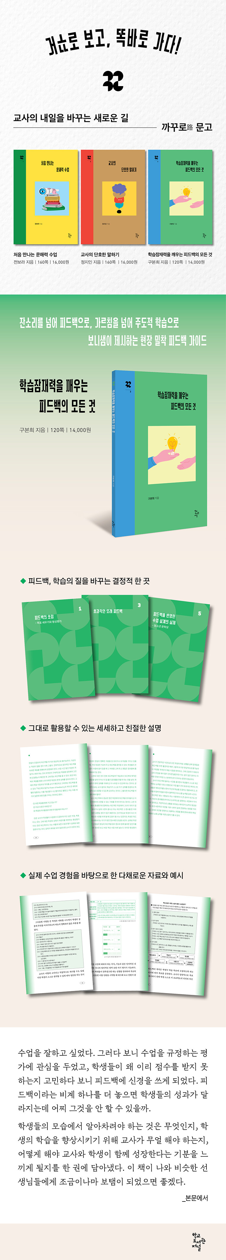 ÀúÀÚ´Â ¹Ù»Û ¾÷¹« ¼Ó¿¡¼ Çǵå¹éÀÇ °ñµçŸÀÓÀ» ³õÄ¡°í ÀÖ´Â ±³»çµéÀÇ Çö½ÇÀûÀÎ °í¹Î¿¡ ÀÀ´äÇÑ´Ù. Çлýµé¿¡°Ô ÁÁÀº Çǵå¹éÀ» ÁÖ°í ½ÍÀºµ¥ ¸·»ó ¾îµð¼ºÎÅÍ ¾î¶»°Ô ½ÃÀÛÇØ¾ß ÇÒÁö ¸ô¶ó ¸·¸·ÇØÇÏ´ø ±³»çµé¿¡°Ôµµ ÇØ´äÀ» ³»·Á ÁØ´Ù. ´Ù³â°£ÀÇ ¿¬±¸¸¦ ÅëÇØ °í¾ÈÇÑ Ã¼°èÀûÀÎ Çǵå¹é ¸Å´º¾óÀ» ´ã¾ÒÀ¸¸ç, ´Ü¼øÈ÷ À̷п¡ ±×Ä¡Áö ¾Ê°í ±³½Ç¿¡ ¹Ù·Î Àû¿ëÇÒ ¼ö ÀÖ´Â ½Ç¿ëÀûÀÎ °¡À̵带 Á¦½ÃÇϰíÀÚ Çß´Ù.
