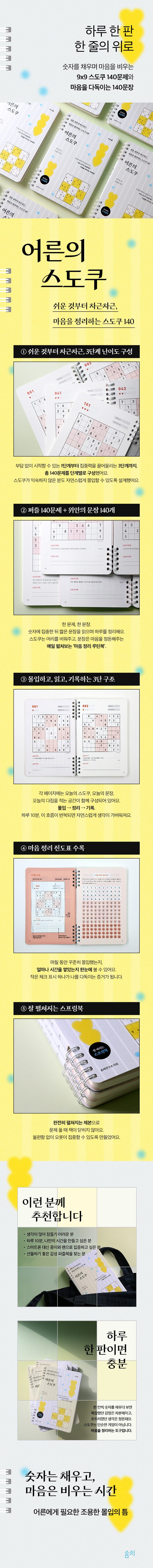 ÀÌ Ã¥Àº ÃÑ 140°³ÀÇ ½ºµµÄí ÆÛÁñÀ» ¼¼ °¡Áö ³À̵µ·Î ±¸¼ºÇß½À´Ï´Ù. ½¬¿î ÆÛÁñ·Î ½ÃÀÛÇØ Á¡Â÷ ³À̵µ¸¦ ³ô¿©°¡¸ç ÀÚ¿¬½º·´°Ô ¸ôÀÔ°¨À» ³ôÀÏ ¼ö ÀÖµµ·Ï ¹èÄ¡Çß½À´Ï´Ù. ½ºµµÄí ÇÏ´Ü¿¡´Â ª°í À§·Î°¡ µÇ´Â ¹®ÀåÀ» ½Ç¾î µÎ¾ú°í, ÇϷ縦 ¸¶¹«¸®ÇÏ´Â '¿À´ÃÀÇ ´ÙÁü'À» Àû´Â °ø°£µµ ÇÔ²² ¸¶·ÃÇß½À´Ï´Ù. ¸ÅÀÏ ÇÑ À徿 ¹®Á¦¸¦ Ç®°í, ¹®ÀåÀ» Àаí, ½º½º·ÎÀÇ ¸¶À½À» µé¿©´Ùº¸¸ç ªÀº ±â·ÏÀ» ³²±â´Â ÀÌ ¼¼ °¡Áö ·çƾÀº, ¹Ù»Û ÀÏ»ó ¼Ó¿¡¼µµ ¸¶À½Ã¬±èÀ» ½ÇõÇÒ ¼ö ÀÖ´Â °£´ÜÇÏÁö¸¸ °·ÂÇÑ ¹æ¹ýÀÌ µË´Ï´Ù.