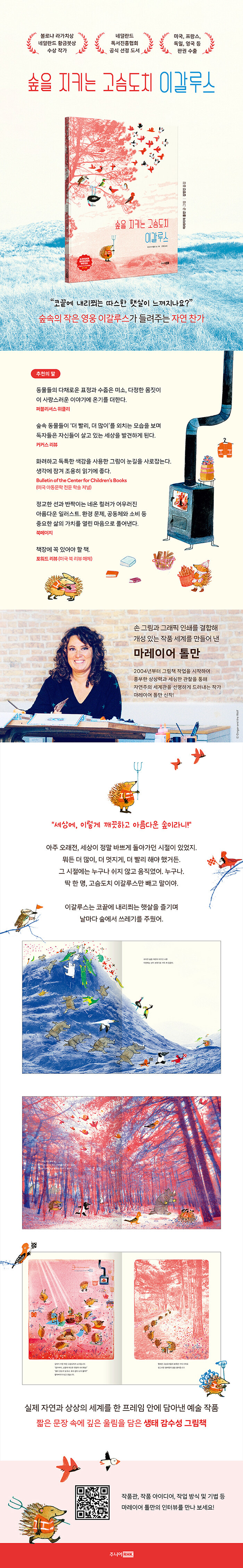 ¡¶½£À» ÁöŰ´Â °í½¿µµÄ¡ À̰¥·ç½º¡·´Â À̰¥·ç½º¿Í ½£¼Ó µ¿¹°µéÀÇ À̾߱⸦ ÅëÇØ ÀÚ¿¬ÀÇ ¼ÒÁßÇÔ, Àΰ£°ú ÀÚ¿¬ÀÇ °ü°è, ¿¬´ëÀÇ °¡Ä¡¸¦ ¼¶¼¼ÇÏ°Ô ±×·Á ³½ ȯ°æ ¿ìÈ ±×¸²Ã¥ÀÌ´Ù. ±¹³»¿¡µµ ¼Ò°³µÈ º¼·Î³Ä ¶ó°¡Ä¡»ó ¼ö»óÀÛ ¡¶³ª¹«Áý¡·À¸·Î ÀÚ¿¬ÁÖÀÇ ¼¼°è°üÀ» ºÐ¸íÇÏ°Ô µå·¯³Â´ø ÀÛ°¡ ¸¶·¹À̾î Å縸Àº À̹ø ÀÛǰ¿¡¼µµ µû¶æÇÑ ½Ã¼±À¸·Î ÀÚ¿¬À» ¹Ù¶óº»´Ù. ÀÛ°¡´Â µ¶Àڵ鿡°Ô Àΰ£ÀÌ ÀÚ¿¬ÀÇ ÀϺÎÀÓÀ» ´Ù½Ã±Ý Àϱú¿ì¸ç ¸ðµç »ý¸íÀÌ ÀÚ¿¬°ú Á¶È·Ó°Ô, ´õºÒ¾î »ì¾Æ°¡±â¸¦ ¹Ù¶ó´Â ¸¶À½À» °í½º¶õÈ÷ ÀüÇÑ´Ù.