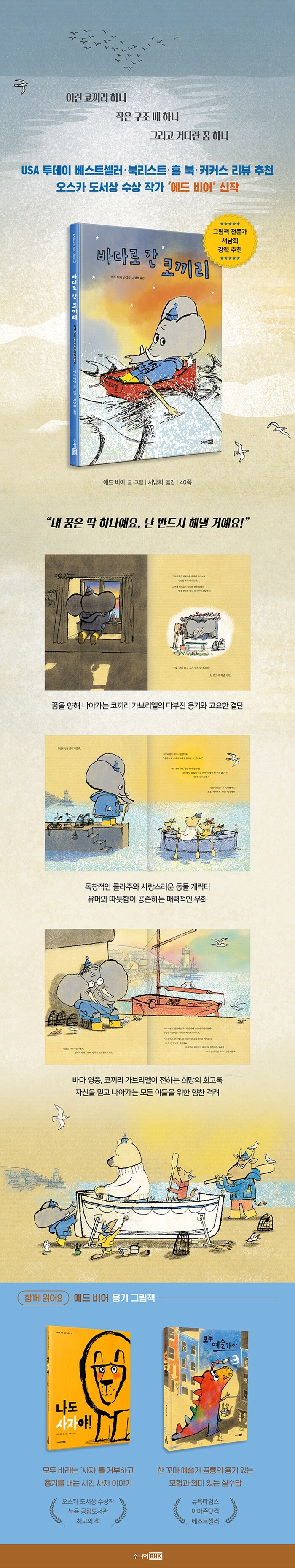 ¼Á¤ÀûÀÎ ¾Æ¸§´Ù¿î ±Û¿¡ ÀºÀºÇÑ ÁÖȲ, ÆÄ¶û, ³ë¶ûÀÇ »ö°¨, ÄݶóÁÖ¿Í ¼öäȸ¦ È¥ÇÕÇÑ ¡®¿¡µå ºñ¾î¡¯ Ç¥ ä»ö ±â¹ýÀº ±íÀº ¿©¿îÀ» ÁØ´Ù. »ç¶û½º·´°í °³¼º °ÇÑ µ¿¹° ij¸¯Å͵éÀÇ µîÀå ¶ÇÇÑ ½Ã¼±À» »ç·ÎÀâ´Â´Ù. »¡°£ ¹è¸¦ ź ¹Ù´Ù ±¸Á¶ ´ë¿ø ÄÚ³¢¸® °¡ºê¸®¿¤À» ºñ·ÔÇØ °¡ºê¸®¿¤ÀÇ ´Ü¦ °í¾çÀÌ, ¹Ù´Ù ±¸Á¶´ë·Î Ȱ¾àÇÏ´Â °¾ÆÁö, µÅÁö, °õ, °í½¿µµÄ¡, Åä³¢ µî ¾ÆÀ̵鿡°Ô Ä£¼÷ÇÑ µ¿¹° ij¸¯Å͵éÀº ¸Å ÆäÀÌÁö º¸´Â Áñ°Å¿òÀ» ¼±¹°ÇÑ´Ù. µ¿¹° ÁÖÀΰøµéÀÌ ÇÔ²² ¿¬´ëÇÏ¿© Å« À§±â¸¦ ÇìÃijª°¡´Â Àå¸éµéÀº µû¶æÇÑ °¨µ¿À» ÀüÇÑ´Ù. ¡°¾î±â¿©Â÷ ³ª°¡½Å´Ù. ¾î±â¿©Â÷-¿¡¾ß!¡± ¿îÀ²°¨ ³ÑÄ¡´Â ¿ì··Âù ¹î³ë·¡µµ Ã¥ Àд ±â»ÝÀ» ´õÇÑ´Ù.