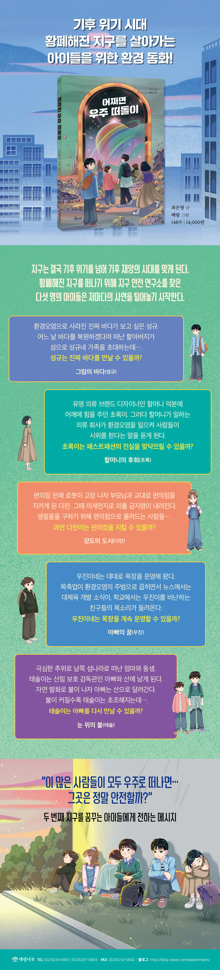 ¡¶¾î¼¸é ¿ìÁÖ ¶°µ¹ÀÌ¡·´Â ±âÈÄ Àç¾Ó ½Ã´ë¿¡ ¹ú¾îÁú »ç°ÇÀ» ³ª¿ÇÏ´Â µ¥ ±×Ä¡Áö ¾Ê°í ȯ°æ ¹®Á¦°¡ ¾ÆÀ̵éÀÇ »î¿¡ ¾î¶² ¿µÇâÀ» ¹ÌÄ¡´ÂÁö º¸¿© ÁÝ´Ï´Ù. °Å±â´Ù ÇØ¶û ÀÛ°¡ÀÇ Çö½Ç°¨ ³ÑÄ¡´Â ±×¸²ÀÌ ´õÇØÁ® ¸ôÀÔ°¨À» ³ôÀÔ´Ï´Ù. ÀÌ Ã¥¿¡ µîÀåÇÏ´Â ´Ù¼¸ ¸íÀÇ ¾ÆÀ̵éÀº ȯ°æ ¹®Á¦·Î °¡Á· °£¿¡, Ä£±¸ °£¿¡ °¥µîÀ» °Þ½À´Ï´Ù. ¸ðµÎ°¡ ¿°·ÁÇÏÁö¸¸ Å©°Ô ¿Í ´êÁö ¾Ê¾Ò´ø ȯ°æ ¹®Á¦°¡ ÀÏ»óÀ» ±ú¶ß¸®¸é ¾ÆÀ̵éÀÇ »îÀÌ ¾î¶»°Ô Èçµé¸®´ÂÁö ¼¶¼¼ÇÏ°Ô ±×·Á ³Â½À´Ï´Ù. ƯÈ÷ ȯ°æ¿À¿°ÀÇ ÁÖ¹üÀ¸·Î ¼Õ²ÅÈ÷´Â ÆÐ½ºÆ®ÆÐ¼Ç°ú ¸ñÃà¾÷ÀÇ ¹Ì·¡¸¦ º¸¿© ÁÖ¸é¼ ±âÈÄ À§±â ½Ã´ë¿¡ ¾î¶² °¡Ä¡¸¦ ÁÀ¾Æ¾ß ÇÏ´ÂÁö »ý°¢ÇØ º¸°Ô²û ¸¸µì´Ï´Ù.