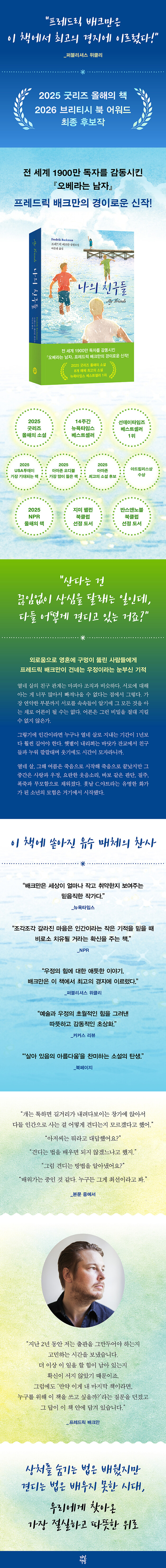¡º³ªÀÇ Ä£±¸µé¡»Àº <º£¾îŸ¿î> 3ºÎÀÛÀ» Á¦¿ÜÇÏ¸é ¡ººÒ¾ÈÇÑ »ç¶÷µé¡» ÀÌÈÄ·Î 5³â ¸¸¿¡ ³»³õÀº ÀåÆí¼Ò¼³ÀÌ´Ù. Æø·Â°ú »óó, ¿Ü·Î¿òÀ» µó°í ¼¼´ë¸¦ ÃÊ¿ùÇÑ ¿ìÁ¤°ú »ç¶ûÀÇ ÈûÀ» º¸¿©ÁÖ´Â À̹ø ÀÛǰÀº ±×°£ ¼Õ²Å¾Æ ±â´Ù·Á¿Â µ¶Àڵ鿡°Ô ºÎÀÀÇϵí Ãâ°£°ú µ¿½Ã¿¡ ´º¿åŸÀÓ½º º£½ºÆ®¼¿·¯ 1À§¿¡ ¿Ã¶ú°í 2025³â ±Â¸®Áî ÃÖ°íÀÇ ¼Ò¼³, NPR ÃÖ°íÀÇ ¼Ò¼³°ú Áö¹Ì ÆÓ·± ºÏŬ·´ µî¿¡ ¼±Á¤µÇ¾ú´Ù. Æò±Õ º°Á¡ 4.6Á¡, 40¸¸ °³¿¡ À°¹ÚÇÏ´Â Àü ¼¼°è µ¶ÀÚµéÀÇ Èı⵵ ¡®¹èÅ©¸¸½Ä ½ºÅ丮ÅÚ¸µ¡¯ÀÌ ¿©ÀüÈ÷ µ¶º¸ÀûÀÎ À§Ä¡¿¡ ÀÖÀ½À» Áõ¸íÇÑ´Ù.