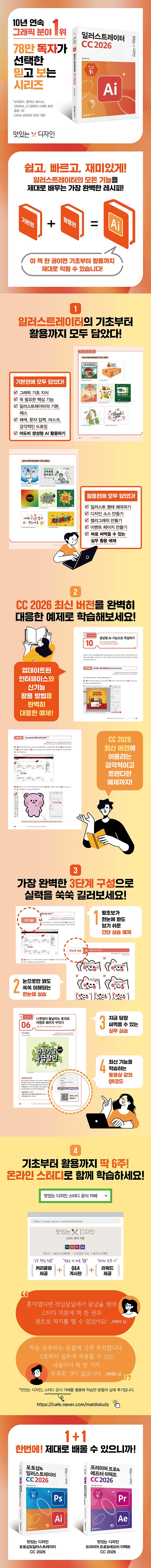±×·¡ÇÈ µðÀÚÀο¡ ²À ÇÊ¿äÇÑ ÀÏ·¯½ºÆ®·¹ÀÌÅÍÀÇ ±âÃʺÎÅÍ È°¿ë¹ý±îÁö Á¦´ë·Î ¹è¿ï ¼ö ÀÖ½À´Ï´Ù. ÀÏ·¯½ºÆ®·¹ÀÌÅÍÀÇ ±âº»&ÇÙ½É ±â´ÉÀ» ²Ä²ÄÇÏ°Ô ¼³¸íÇÏ¿© ±âº»±âºÎÅÍ ÅºÅºÇÏ°Ô ´ÙÁú ¼ö ÀÖÀ¸¸ç, ´Ù¾çÇÑ ½Ç¹« ¿¹Á¦¸¦ ¼ö·ÏÇÏ¿© ÁÖ¿ä ±â´ÉÀÇ È°¿ë¹ýÀ» È¿°úÀûÀ¸·Î ÀÍÈú ¼ö ÀÖ½À´Ï´Ù. ÃֽйöÀüÀÎ CC 2026¿¡ ¿Ïº®È÷ ´ëÀÀÇÏ¿© »ý¼ºÇü AI°¡ Æ÷ÇÔµÈ ½Å±â´É, Turn Table, Adobe ±âº» ±â´É°ú Ȱ¿ë¹ýÀ» ¿Ïº®ÇÏ°Ô ¸¶½ºÅÍÇÒ ¼ö ÀÖ´Â 3´Ü°è ÇнÀ ¹æ¹ýÀÎ [°£´Ü ½Ç½À] - [ÇÑ´«¿¡ ½Ç½À] - [½Ç¹« Ȱ¿ë]ÀÇ ±¸¼ºÀº ´©±¸³ª ÀÏ·¯½ºÆ®·¹ÀÌÅ͸¦ Á¦´ë·Î ¹è¿ö ¹Ù·Î ½á¸ÔÀ» ¼ö ÀÖµµ·Ï µµ¿ÍÁÝ´Ï´Ù. ¸ÀÀÖ´Â µðÀÚÀÎ ½ºÅÍµð °ø½Ä Ä«Æä¿¡¼ ÁøÇàÇÏ´Â 6ÁÖ ¿Â¶óÀÎ ½ºÅ͵ð ±×·ì¿¡¼´Â ÇнÀ¿¡ À¯¿ëÇÑ Ä¿¸®Å§·³°ú ÁúÀÇÀÀ´ä±îÁö Á¦°øÇϹǷΠÀÏ·¯½ºÆ®·¹ÀÌÅ͸¦ ´õ¿í ½±°Ô ÇнÀÇÒ ¼ö ÀÖ½À´Ï´Ù.