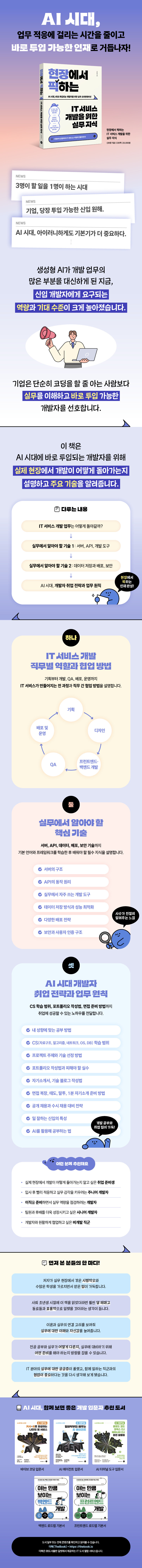 ÀÌ Ã¥Àº IT ¼ºñ½º °³¹ß °úÁ¤°ú Á÷¹«º° ¿ªÇÒ, ½Ç¹«¿¡¼ ¾Ë¾Æ¾ß ÇÒ ÇÙ½É ±â¼ú, AI ½Ã´ë¿¡ °³¹ßÀÚ Ãë¾÷ Àü·«°ú ¾÷¹« ¿øÄ¢À» ´Ù·ì´Ï´Ù. ±âȹºÎÅÍ °³¹ß, QA, ¹èÆ÷, ¿î¿µ±îÁö IT ¼ºñ½º°¡ ¸¸µé¾îÁö´Â °úÁ¤À» ¼³¸íÇϰí, ±× ¾È¿¡¼ °¢ Á÷¹«°¡ ¾î¶»°Ô Çù¾÷ÇÏ´ÂÁö ¾Ë·ÁÁÝ´Ï´Ù. ´õ ³ª¾Æ°¡ °³¹ß¿¡ ÇÊ¿äÇÑ ÇÙ½É ±â¼úÀº ¹°·Ð Ãë¾÷ Áغñ °úÁ¤°ú ÀÔ»ç ÈÄ ¾÷¹« ¿øÄ¢±îÁö Æø³Ð°Ô ´Ù·ì´Ï´Ù.